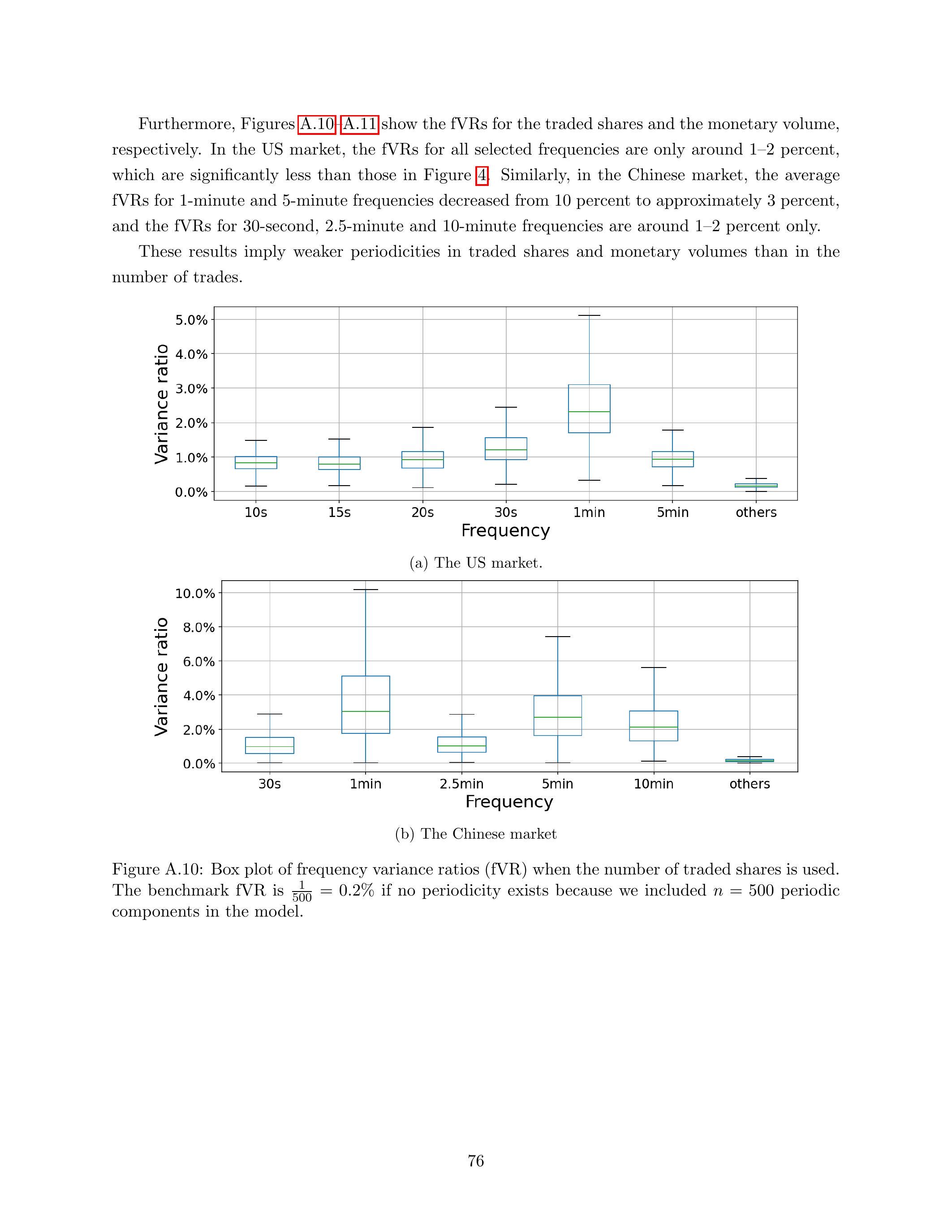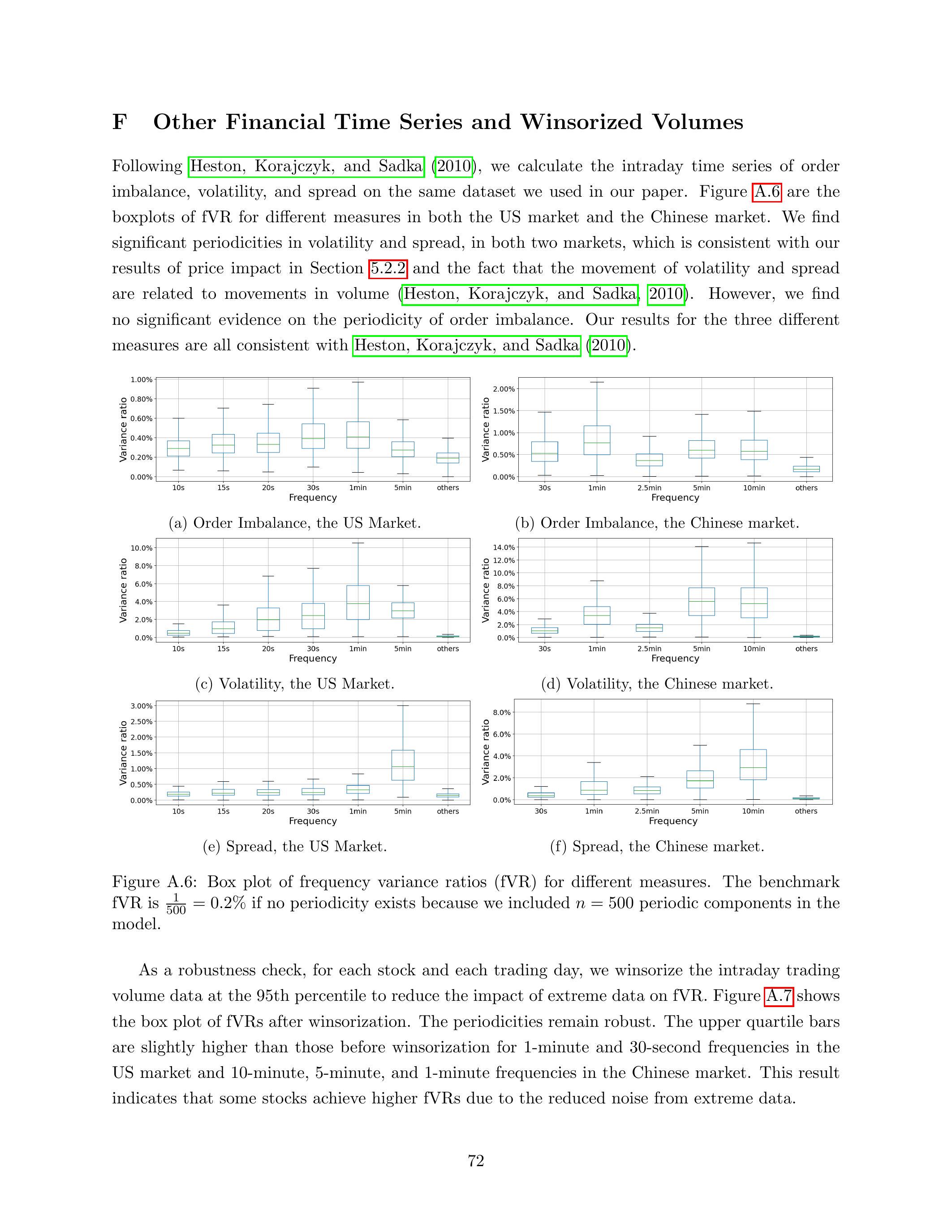 继 Heston, Korajczyk, and Sadka (2010) 之后,我们在我们论文中使用的数据集上计算了订单不平衡、波动率和价差的日内时间序列。图 A. 6 是美国市场和中国市场中不同度量的 fVR 的箱线图。我们发现,在两个市场中,波动率和价差都存在显著的周期性,这与我们在 5.2.2 节中关于价格影响的结果以及波动率和价差的变动与交易量变动相关的事实(Heston, Korajczyk, and Sadka, 2010)相一致。然而,我们没有发现订单不平衡周期性的显著证据。我们关于这三种不同度量的结果都与 Heston, Korajczyk, and Sadka (2010) 的结果一致。