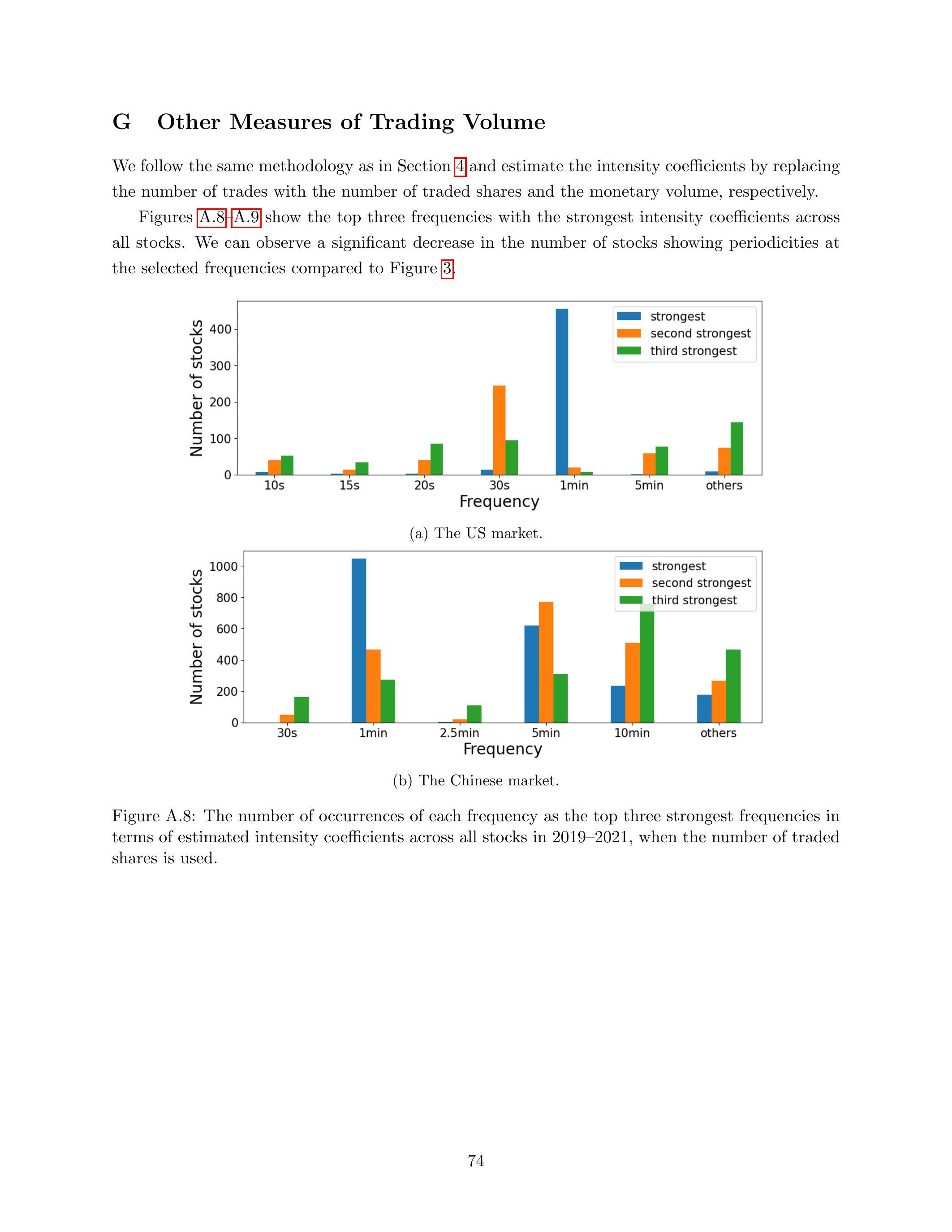 本段是附录G的引言,清晰地陈述了本节的研究任务:将论文正文(第4节)所使用的分析框架,应用到另外两种衡量交易量的指标——成交股数和成交金额上。此举的目的是检验论文关于交易笔数周期性的核心结论,在改变交易量的度量维度后是否依然成立。