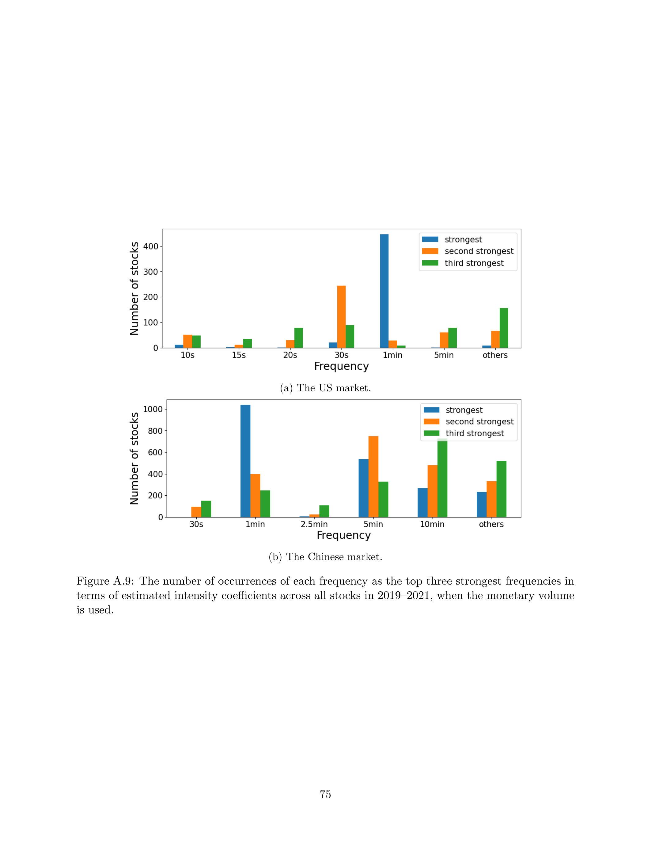 图 A.9:当使用成交金额时,2019-2021 年间所有股票中,就估计的强度系数而言,每个频率作为前三强频率出现的次数。