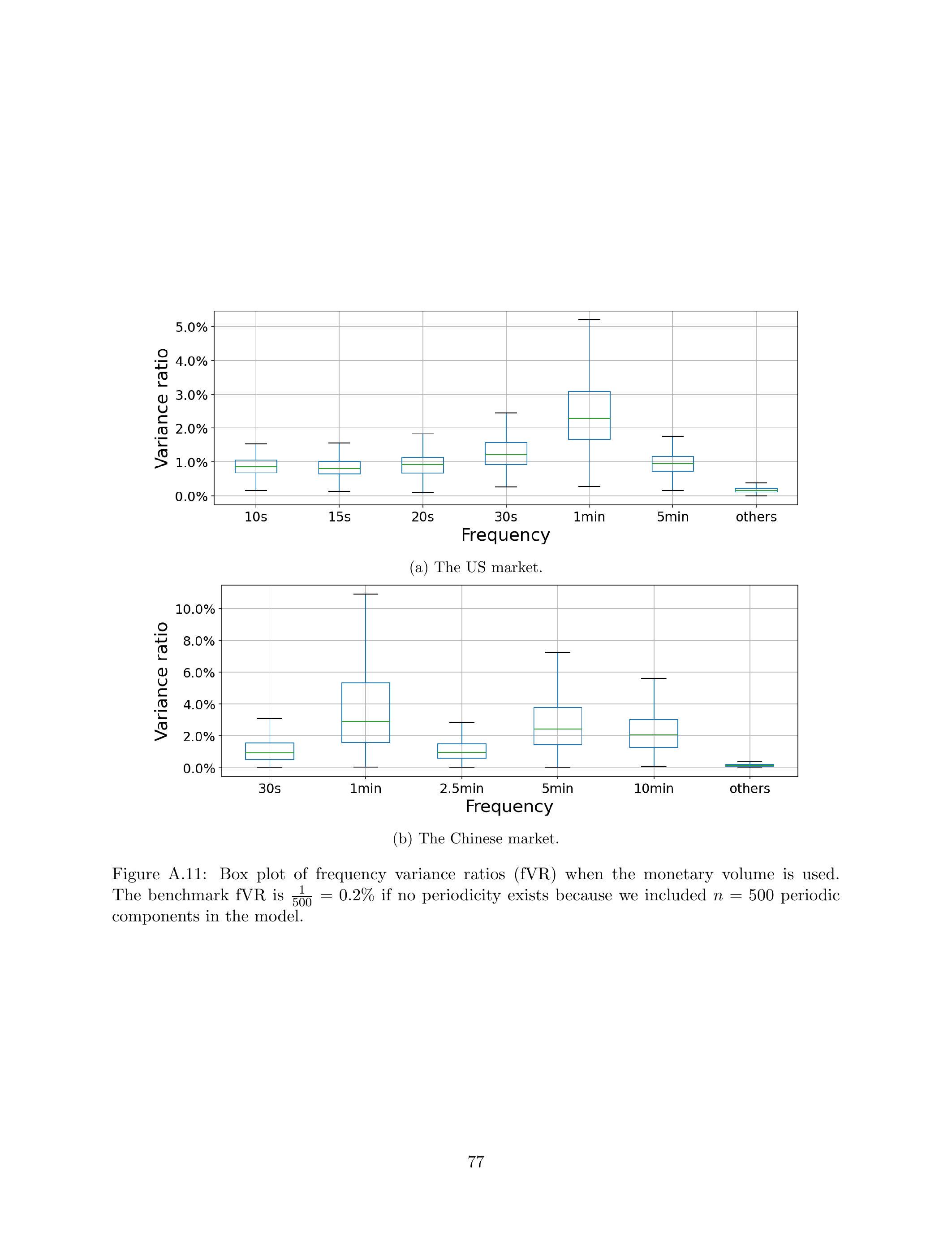 图 A.11:当使用成交金额时的频率方差比 (fVR) 箱线图。如果没有周期性存在,基准 fVR 为 $\frac{1}{500}=0.2 \%$,因为我们在模型中包含了 $n=500$ 个周期性成分。