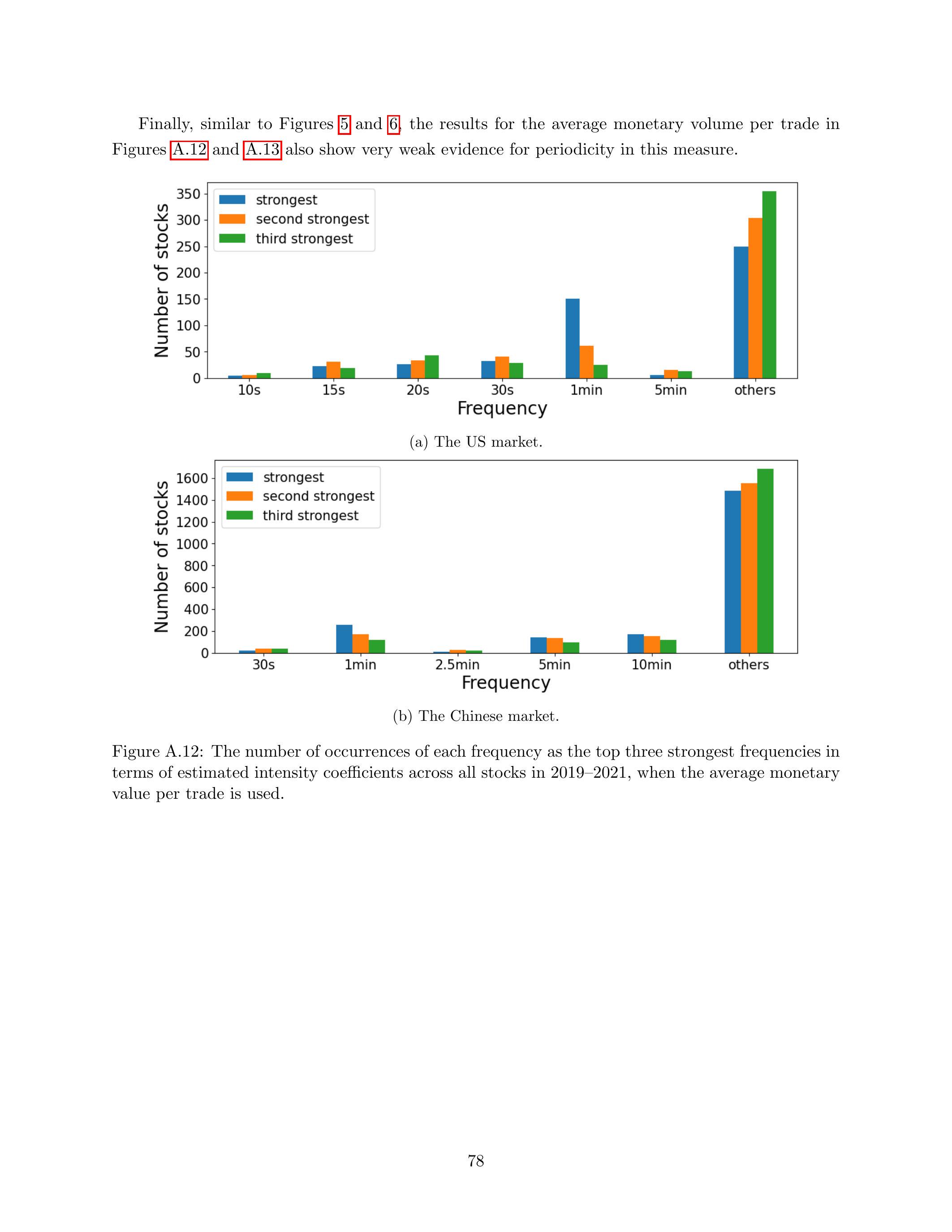 图 A.8 A.9 显示了所有股票中具有最强强度系数的前三个频率。与图 3 相比,我们可以观察到在选定频率上显示出周期性的股票数量显著减少。