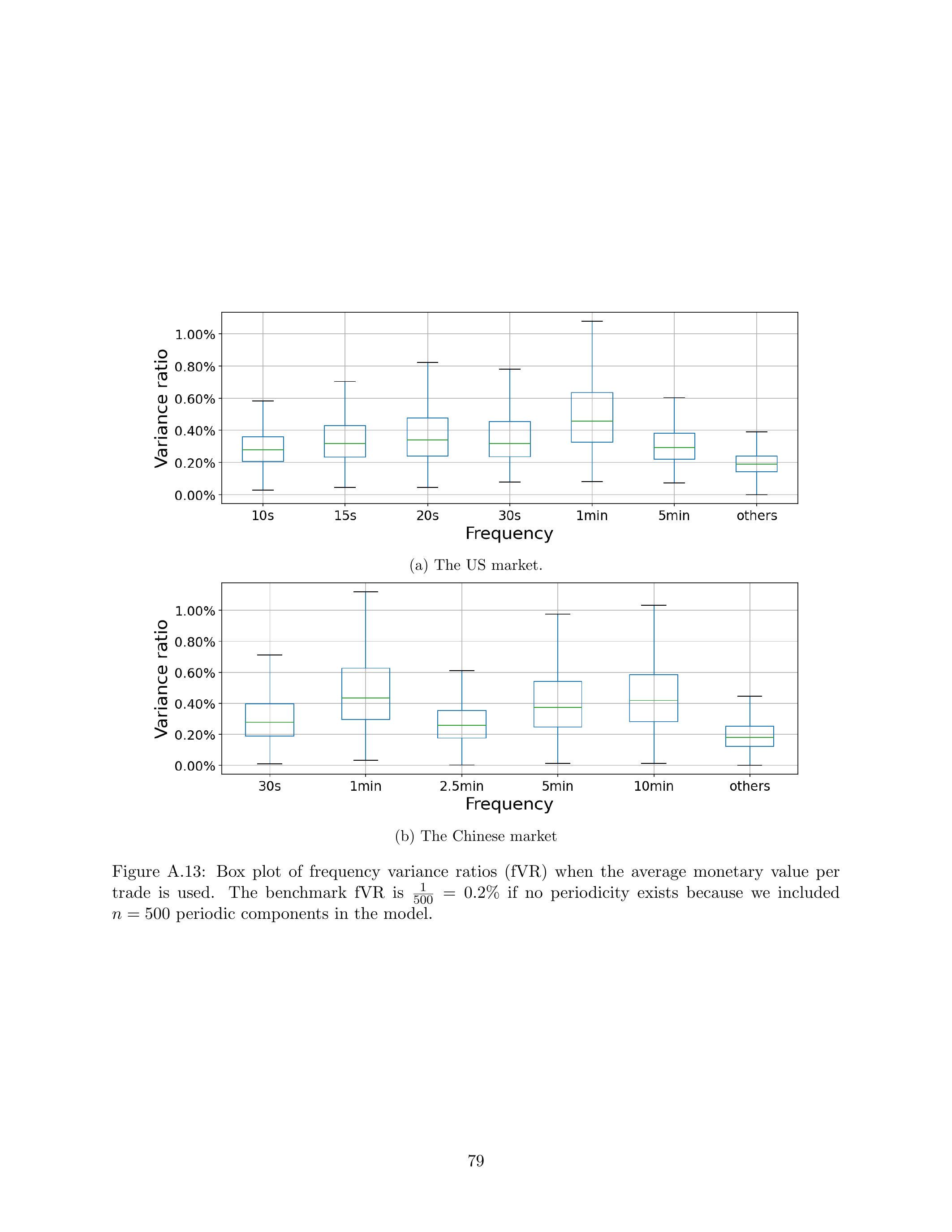 图 A.10:当使用成交股数时的频率方差比 (fVR) 箱线图。如果没有周期性存在,基准 fVR 为 $\frac{1}{500}=0.2 \%$,因为我们在模型中包含了 $n=500$ 个周期性成分。