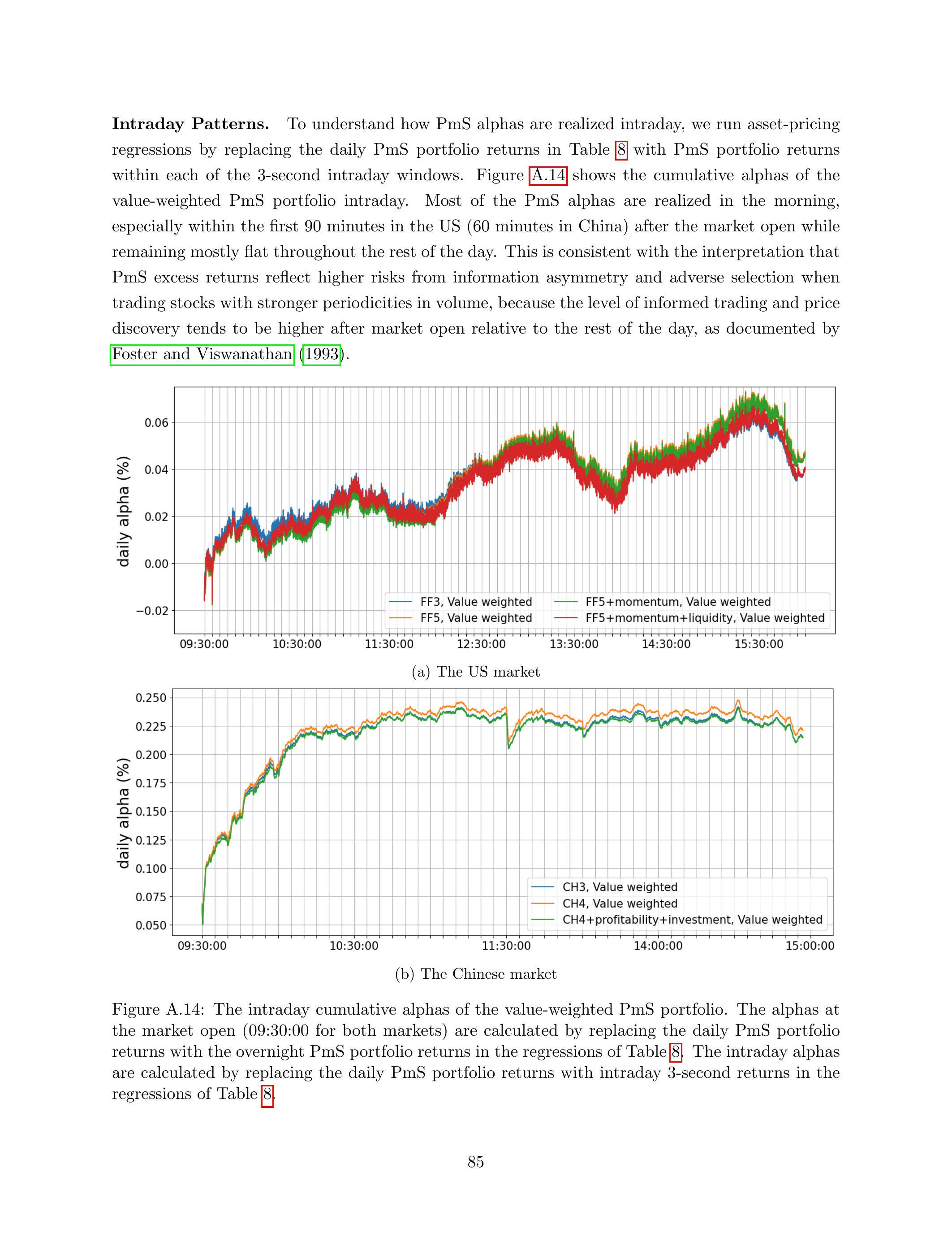 日内模式。为了理解 PmS alphas 是如何在日内实现的,我们通过将表 8 中的每日 $\operatorname{PmS}$ 投资组合回报替换为每个 3 秒日内窗口内的 $\operatorname{PmS}$ 投资组合回报,来进行资产定价回归。图 A. 14 显示了价值加权 $\operatorname{PmS}$ 投资组合的日内累积 alphas。大部分 $\operatorname{PmS}$ alphas 是在早晨实现的,尤其是在美国市场开盘后的前 90 分钟(中国为 60 分钟)内,而在当天剩余时间里则基本持平。这与一种解释相符,即 PmS 超额回报反映了交易具有更强交易量周期性的股票时,来自信息不对称和逆向选择的更高风险,因为与当天其余时间相比,开盘后的知情交易和价格发现水平往往更高,正如 Foster 和 Viswanathan (1993) 所记载的那样。