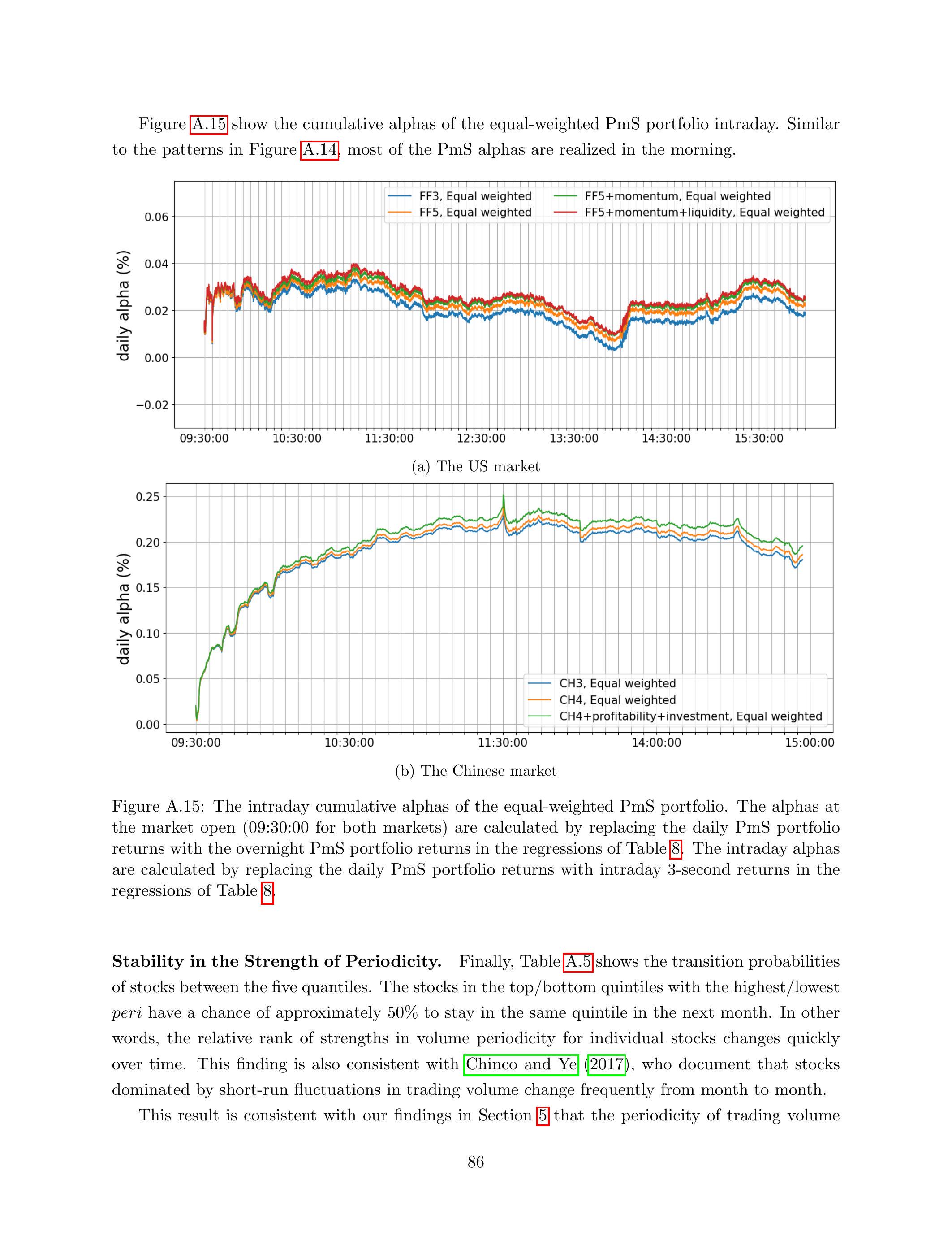 图 A. 15 显示了等权重 PmS 投资组合的日内累积 alphas。与图 A.14 的模式类似,大部分 PmS alphas 是在早晨实现的。