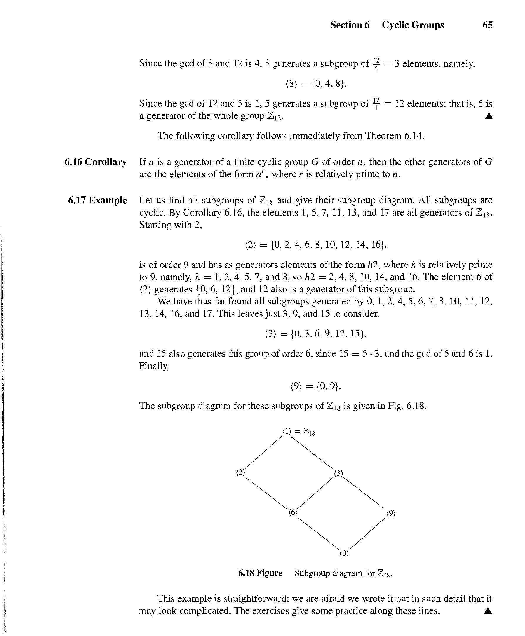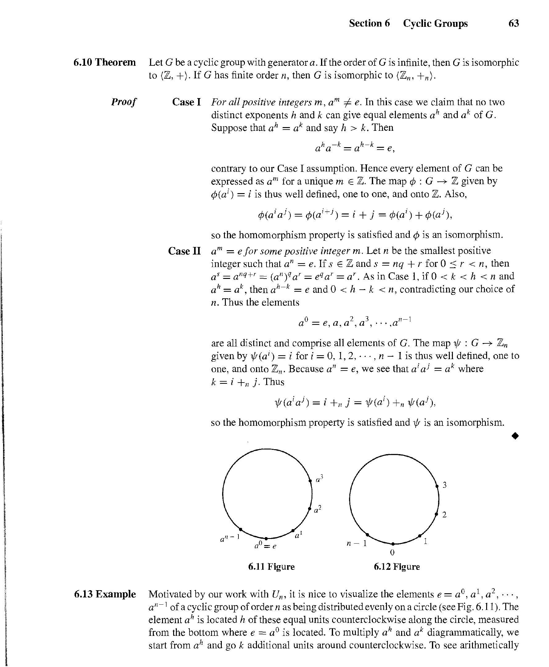 是 $G$ 的一个子群 (定理 5.17)。这个是由 $a$ 生成的循环子群 $\langle a\rangle$。另外,给定一个 $G$ 和 $G$ 中的一个元素 $a$,如果
