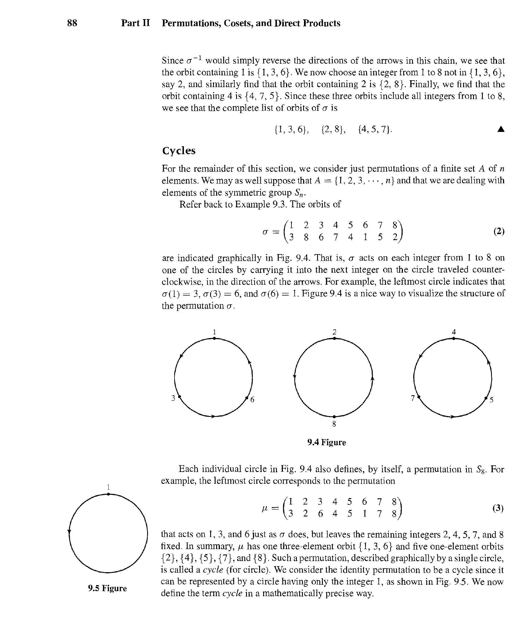 的轨道以图形方式显示在图 9.4 中。也就是说,$\sigma$ 作用于从 1 到 8 的每个整数,将其沿逆时针方向移动到圆上的下一个整数,方向与箭头一致。例如,最左边的圆表示 $\sigma(1)=3, \sigma(3)=6$ 和 $\sigma(6)=1$。图 9.4 是可视化排列 $\sigma$ 结构的好方法。