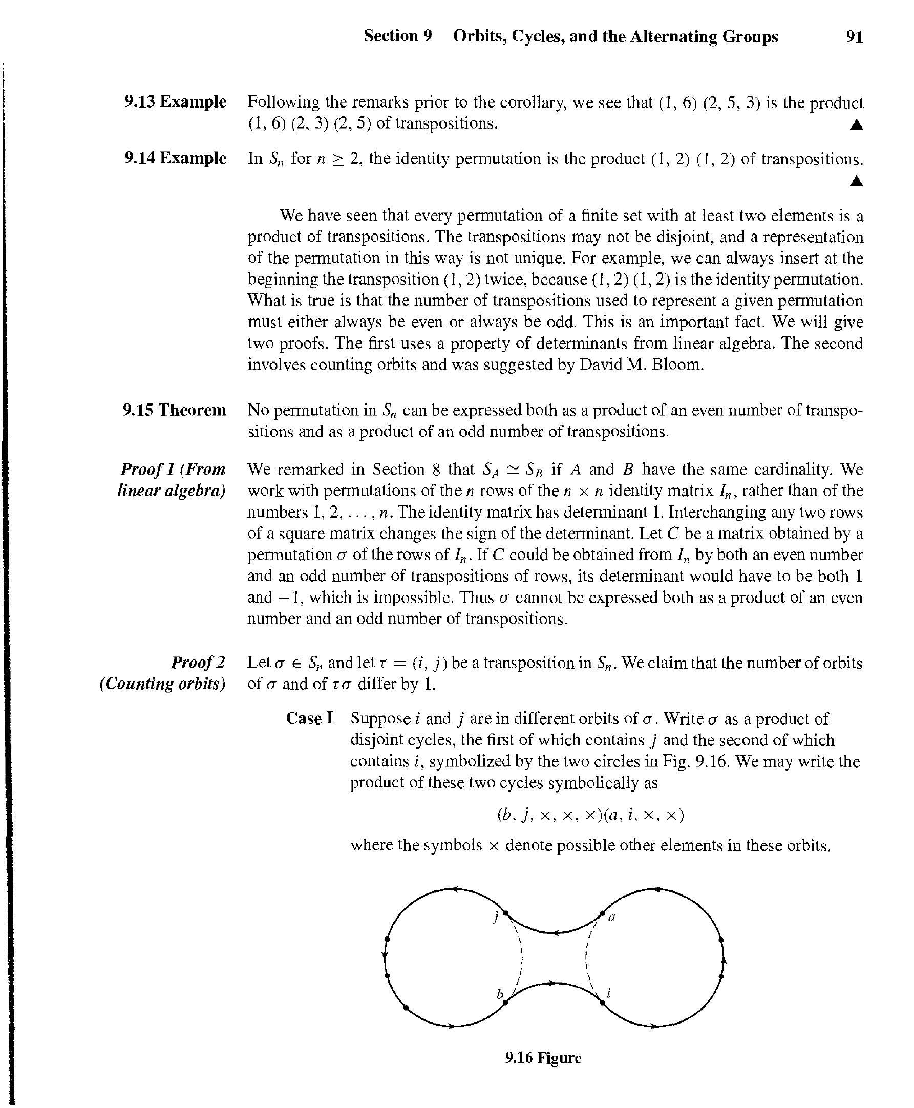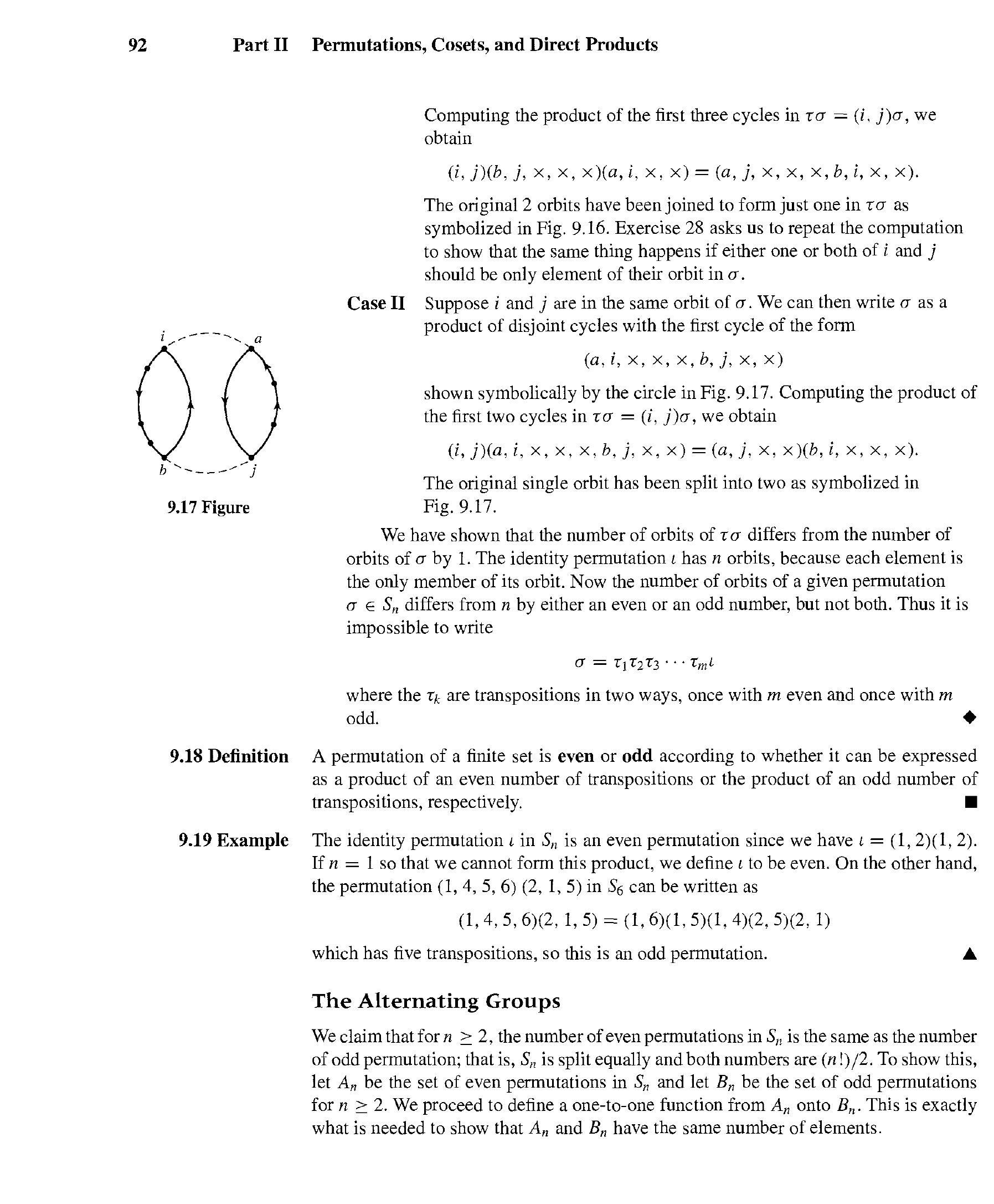 本段正式定义了“轨道”为排列诱导的等价关系下的等价类,并给出了两个示例。例子 9.2 说明了最简单的情况——恒等排列,其轨道都是单个元素。例子 9.3 展示了寻找一个更复杂排列之轨道的一般性、系统性方法:从一个元素出发,沿着排列的映射路径追踪,直到回到起点形成闭环,这个闭环上的所有元素就构成一个轨道;然后从未被访问的元素中再选一个,重复此过程,直到所有元素都被归类。
