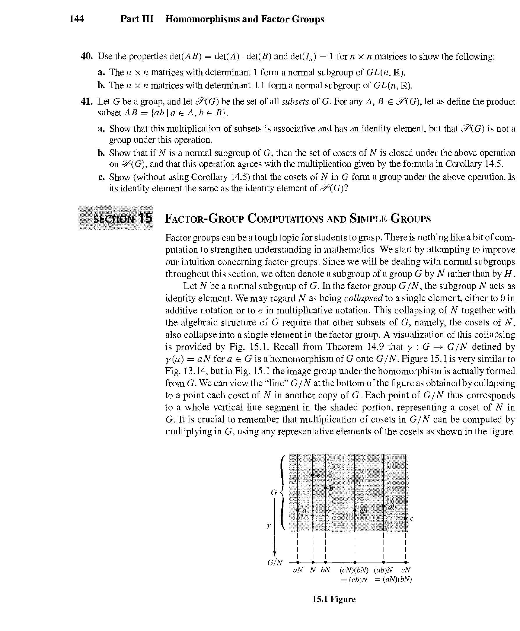 本段是第15节的引言。它指出了商群学习的难点,提出了通过“计算”来建立“直觉”的学习方法,并为了本节的讨论方便,引入了一个符号约定——用 $N$ 特指正规子群。