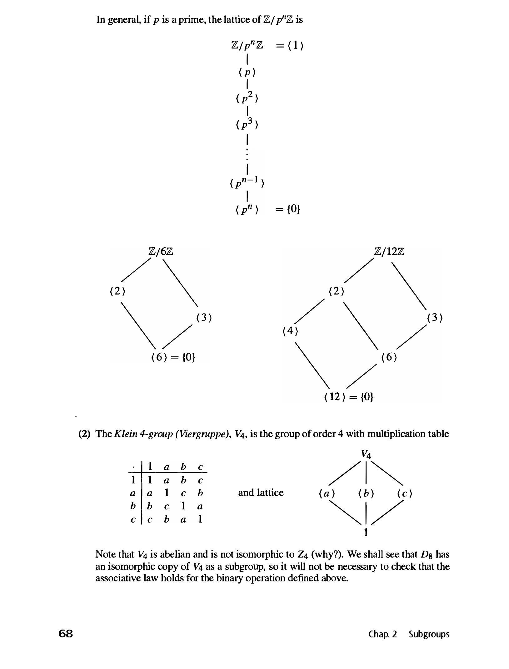 本段的目的是引入第一个非循环群的例子,并展示其子群格。通过与 $\mathbb{Z}_4$ 的对比,它生动地说明了子群格在区分不同群结构上的威力。$V_4$ 是群论中反复出现的“标准件”之一,熟悉它的结构至关重要。