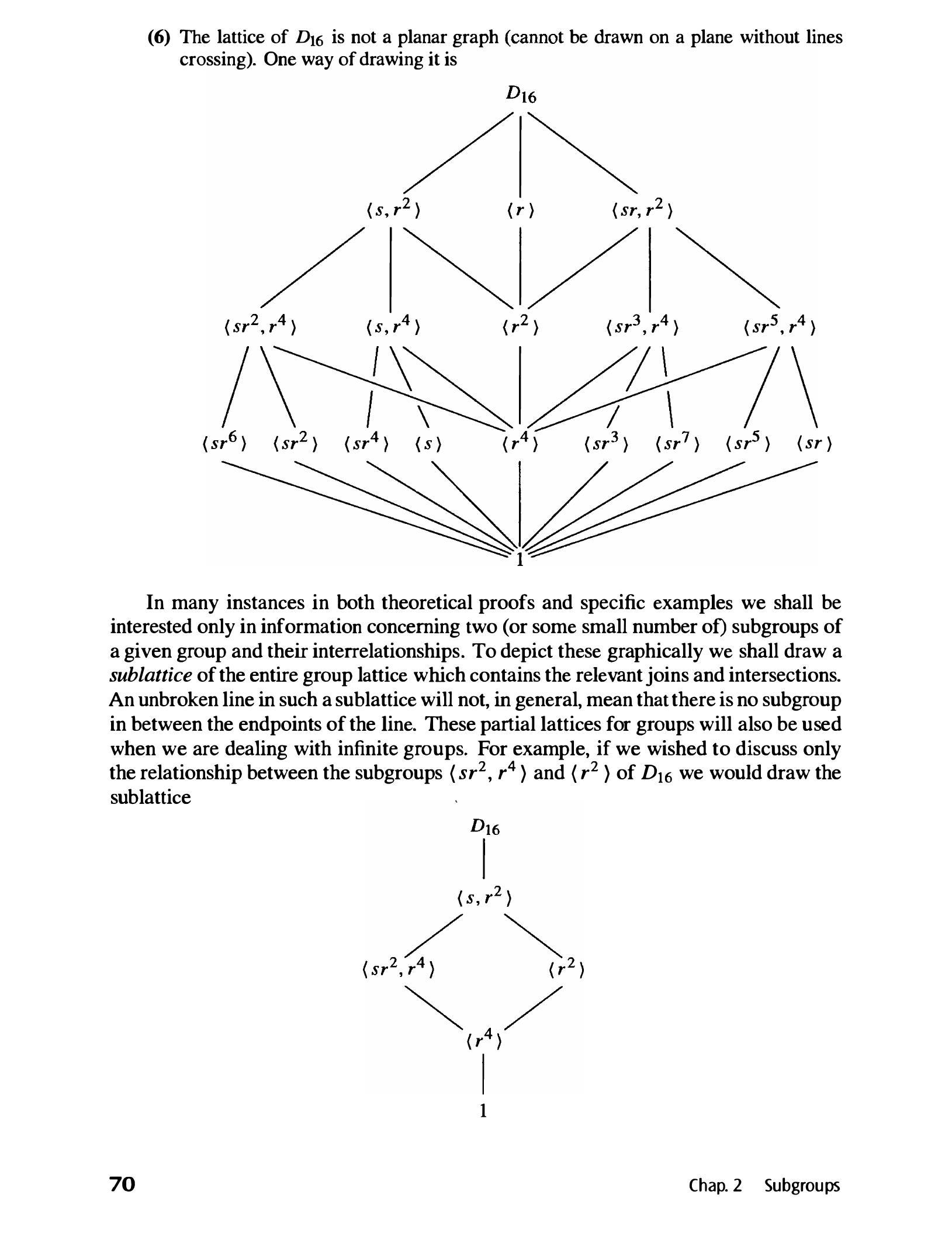 在许多理论证明和具体例子中,我们只对给定群的两个(或少量)子群及其相互关系感兴趣。为了图形化地描绘这些,我们将绘制整个群格的子格,其中包含相关的并和交集。在这种子格中,不间断的线通常并不意味着线的端点之间没有子群。当处理无限群时,也将使用这些群的部分格。例如,如果我们只希望讨论 $D_{16}$ 中子群 $\left\langle s r^{2}, r^{4}\right\rangle$ 和 $\left\langle r^{2}\right\rangle$ 之间的关系,我们将绘制子格