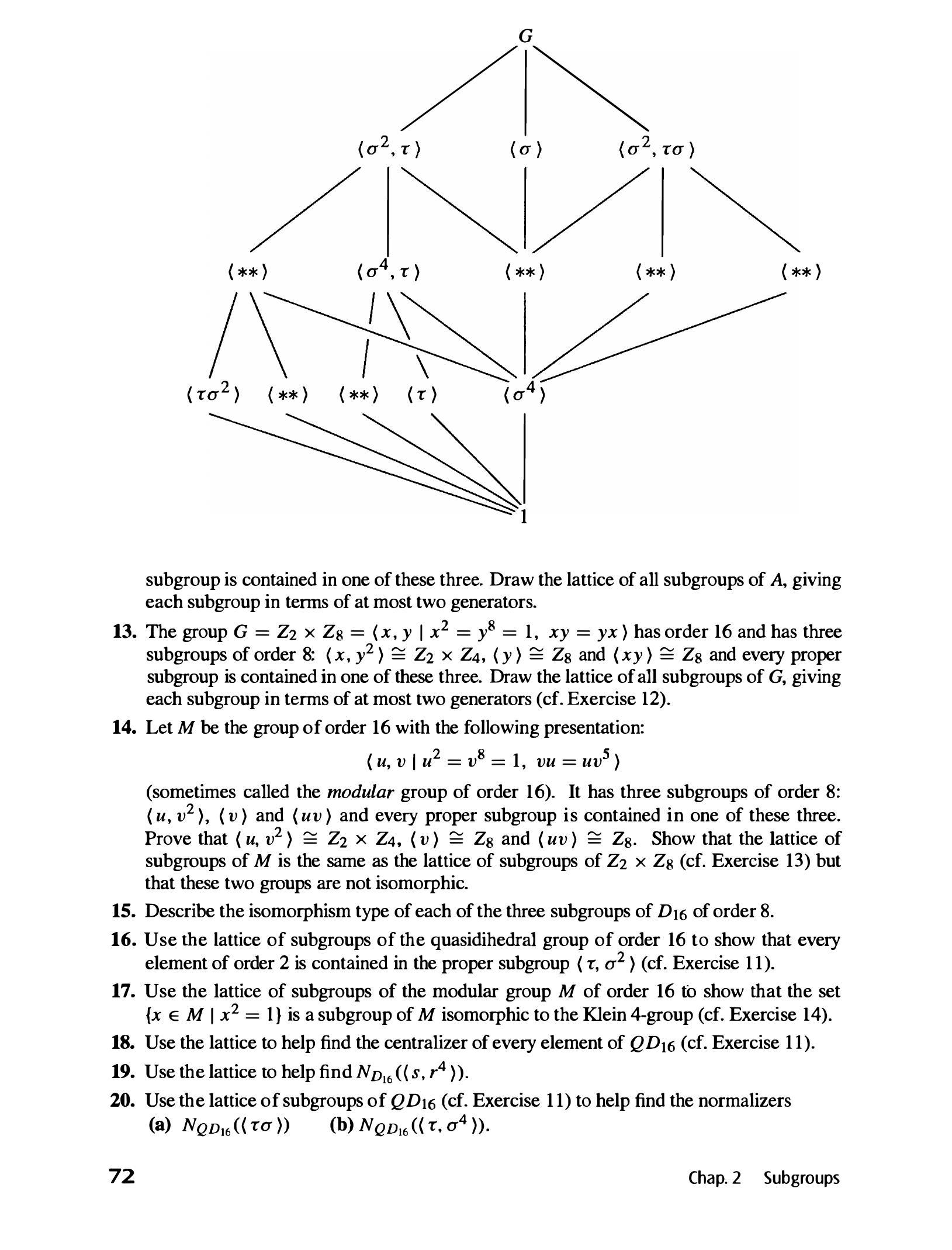 (称为阶为 16 的拟二面体群或半二面体群)。该群有三个阶为 8 的子群: $\left\langle\tau, \sigma^{2}\right\rangle \cong D_{8}, \langle\sigma\rangle \cong Z_{8}$ 和 $\left\langle\sigma^{2}, \sigma \tau\right\rangle \cong Q_{8}$,并且每个真子群都包含在这三个子群之一中。在下一页的拟二面体群所有子群格中填入缺失的子群,每个子群最多用两个生成元表示。(这是非平面格的另一个例子。)