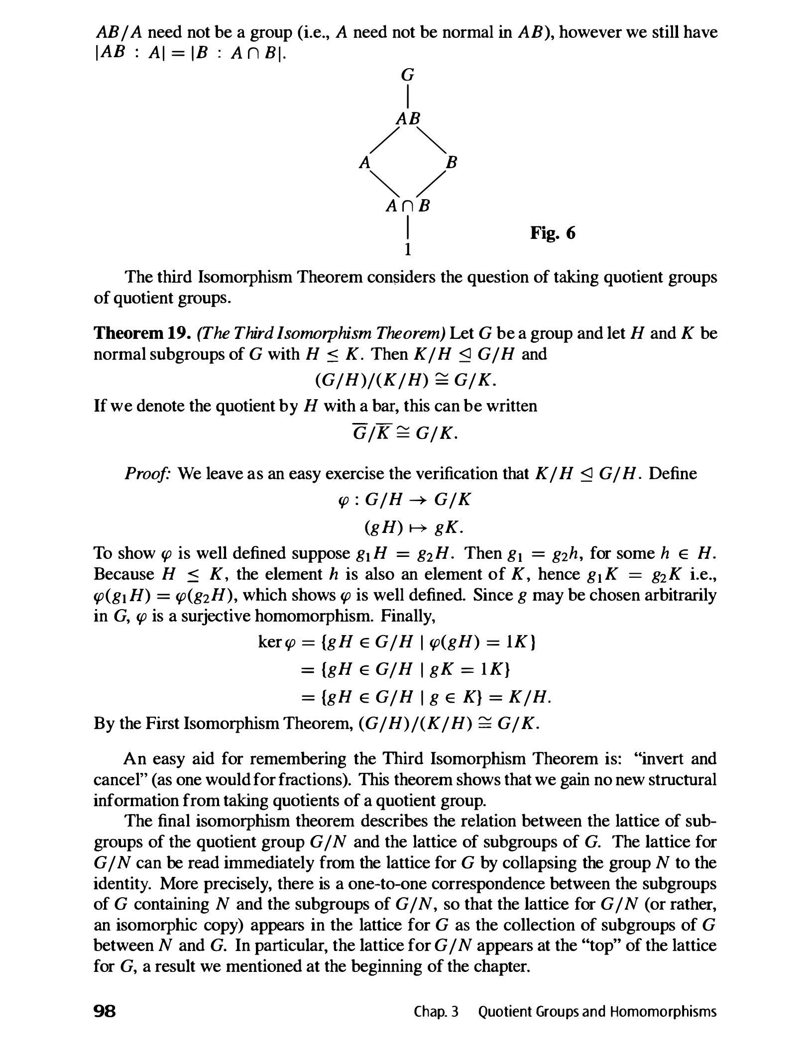 本节我们将推导在第1节讨论过的商群与同态之间关系的一些直接推论。特别是,我们考虑商群 $G/N$ 的子群格与群 $G$ 的子群格之间的关系。第一个结果重述了我们在第1节中关于同态像与核的商之间关系的观察(有时称为同态基本定理):