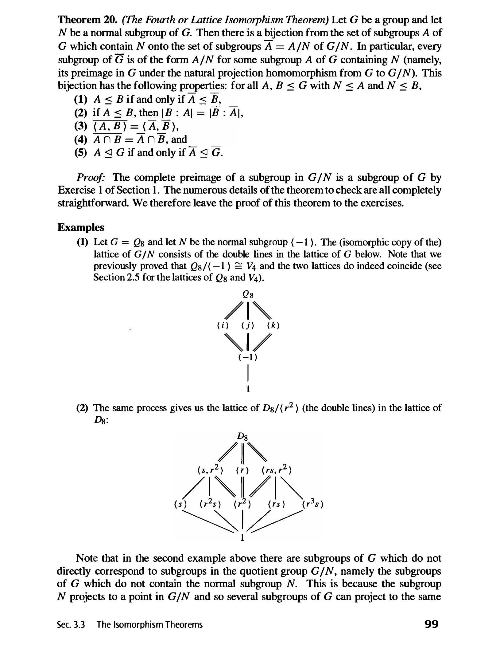 - 子群格的关系: 介绍中提到商群 $G/N$ 的子群格与 $G$ 的子群格的关系,初学者可能会误以为 $G/N$ 的子群就是 $G$ 的子群。实际上,$G/N$ 的子群对应的是 $G$ 中那些“包含”正规子群 $N$ 的子群。这将在后面的第四同构定理(或称格定理)中详细阐述。