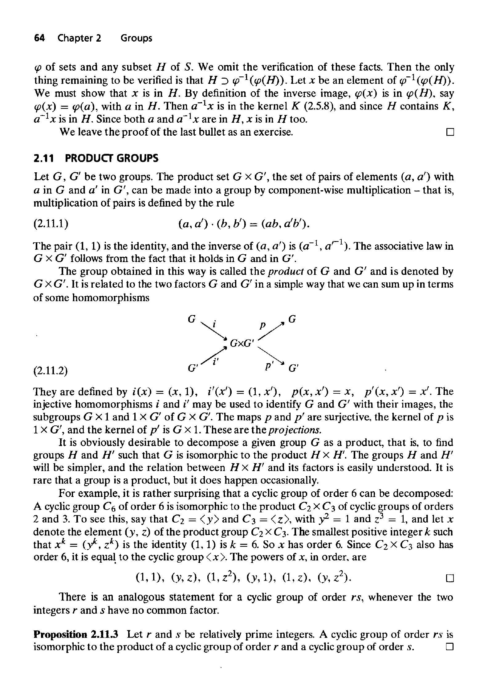命题 2.11.3 给出了循环群可以被分解为更小的循环群的直积的精确条件:当且仅当阶的各个因子相互互素。这是群论中一个非常基本和重要的结构性定理。