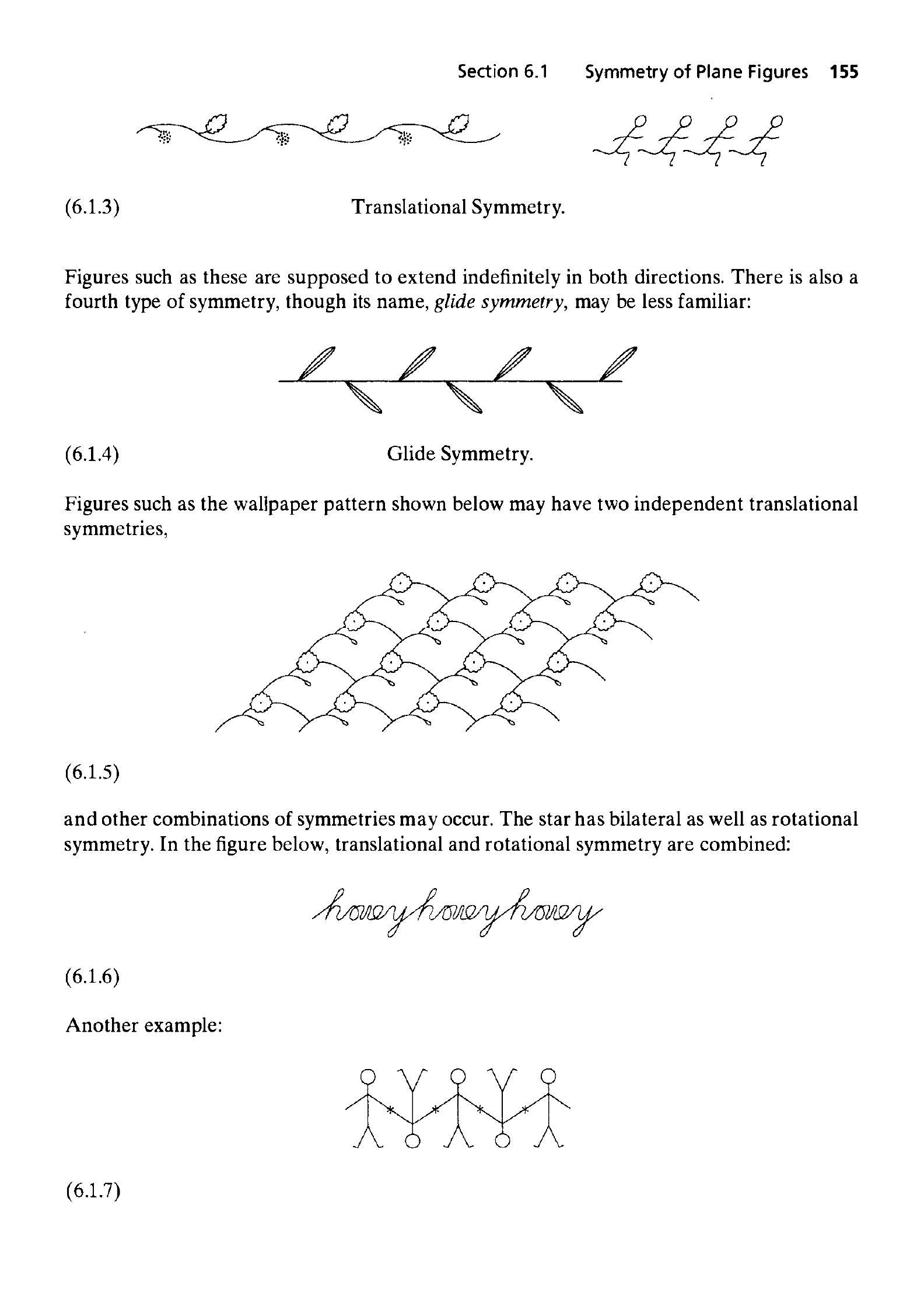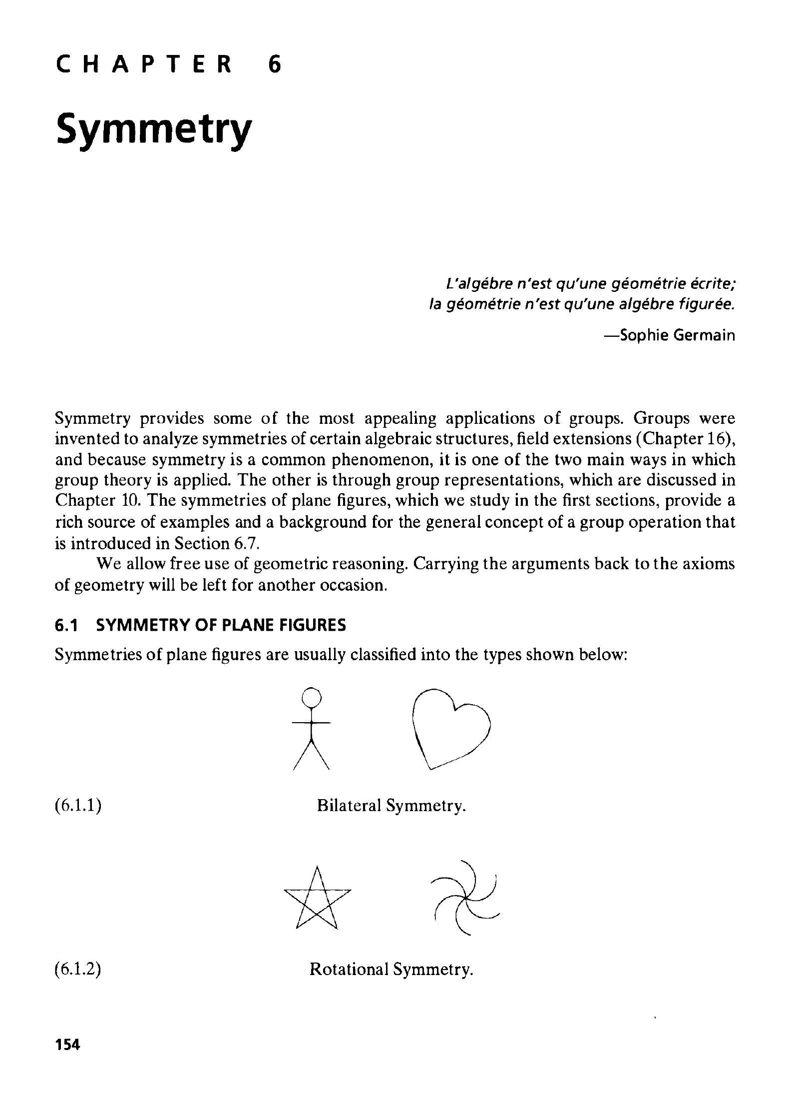 这是第六章的标题。本章的主题是“对称”。对称是数学,特别是群论中一个非常核心和基本的概念。群论本身就是为了形式化和研究对称性而发展起来的。本章将探讨不同类型的对称性,以及如何用群这个代数工具来描述和分析它们。章节标题“对称”明确指出了本章的核心内容,引导读者进入对对称现象的数学化探讨。