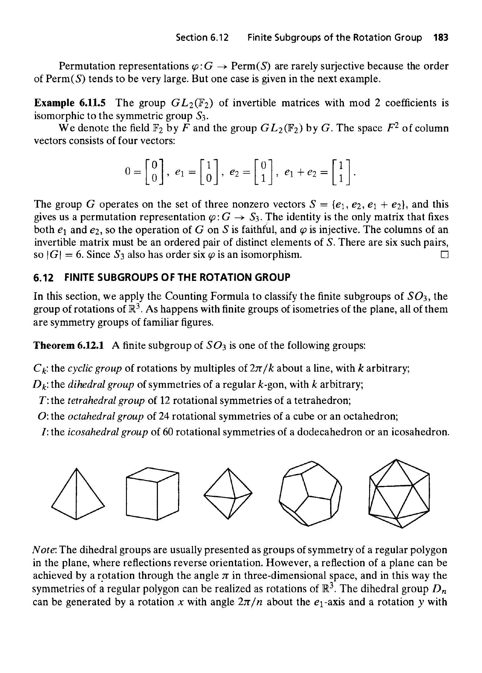 定理6.12.1完整地列出了三维空间中所有可能的有限旋转群。它们分为两大类:两个无限序列 $C_k$ (循环群) 和 $D_k$ (二面体群),以及三个特殊的柏拉图多面体群 $T$ (四面体群)、$O$ (八面体群) 和 $I$ (二十面体群)。