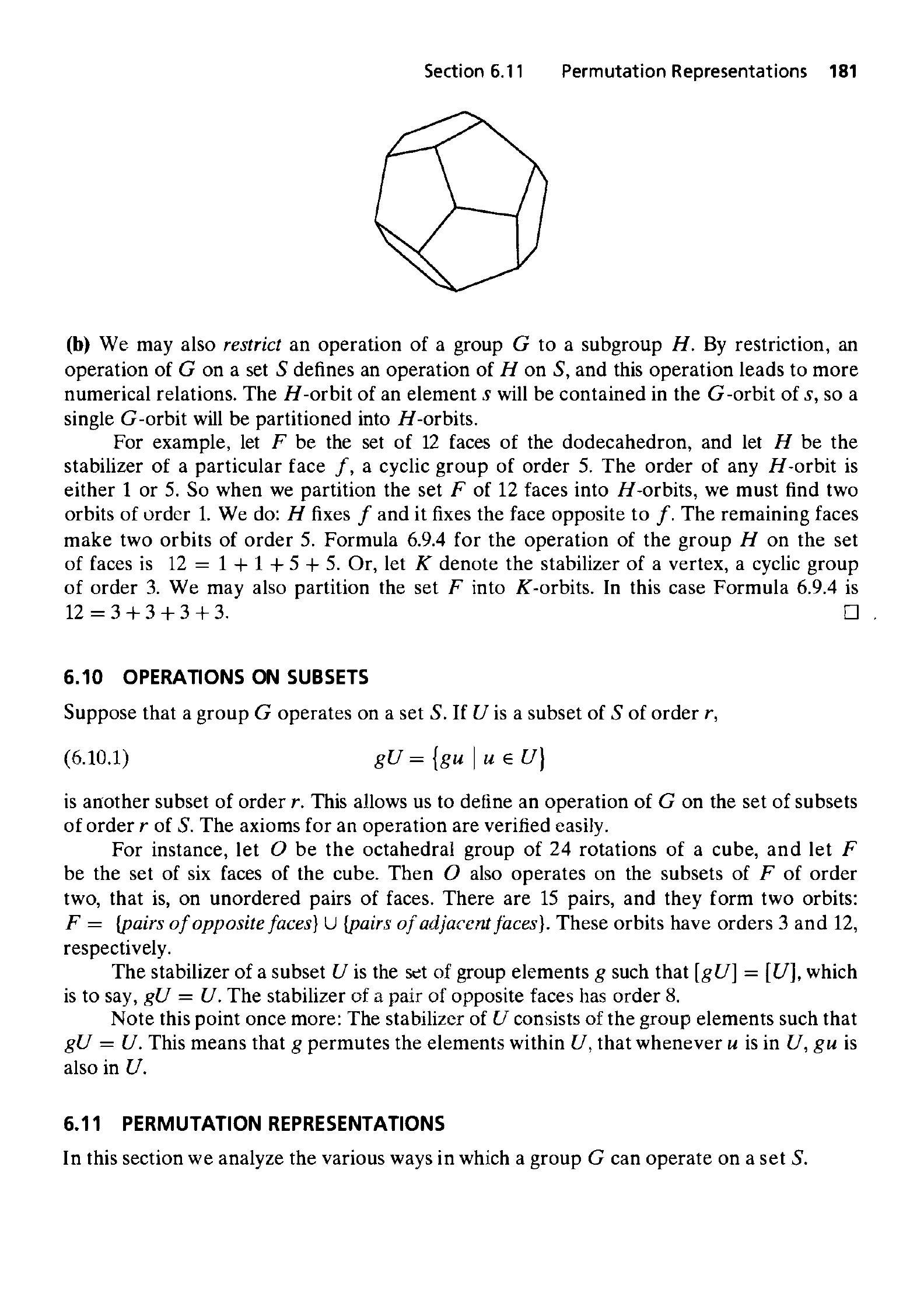 例如,令 $F$ 是十二面体的 12 个面的集合,令 $H$ 是特定面 $f$ 的稳定化子,一个 5 阶的循环群。任何 $H$-轨道的阶要么是 1,要么是 5。因此,当我们把 12 个面的集合 $F$ 划分为 $H$-轨道时,我们必须找到两个阶为 1 的轨道。我们确实找到了:$H$ 固定 $f$,并且它固定与 $f$ 相对的面。其余的面形成两个 5 阶的轨道。群 $H$ 在面的集合上的作用的公式 6.9.4 是 $12=1+1+5+5$。或者,令 $K$ 表示顶点的稳定化子,一个 3 阶的循环群。我们也可以将集合 $F$ 划分为 $K$-轨道。在这种情况下,公式 6.9.4 是 $12=3+3+3+3$。$\square$
