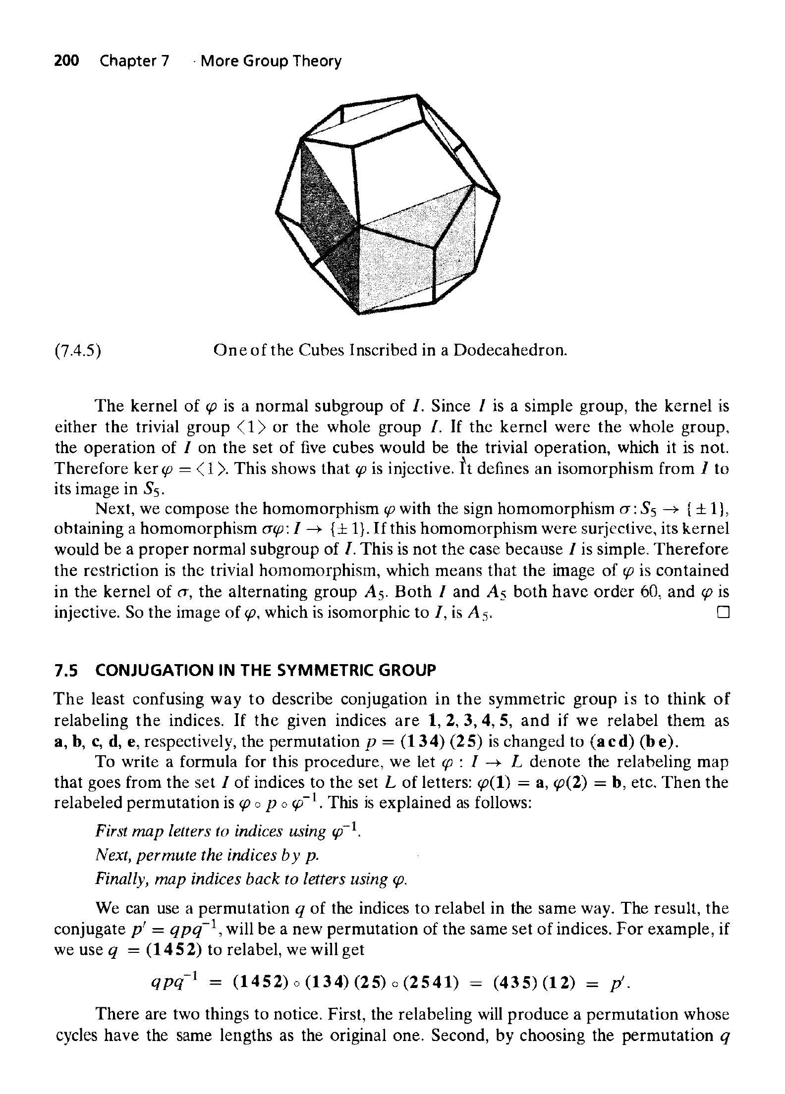 接下来,我们将同态 $\varphi$ 与符号同态 $\sigma: S_{5} \rightarrow\{ \pm 1\}$ 复合,得到一个同态 $\sigma \varphi: I \rightarrow\{ \pm 1\}$。如果这个同态满射的,那么它的将是 $I$ 的一个真正规子群。但事实并非如此,因为 $I$ 是单群。因此这个限制平凡同态,这意味着 $\varphi$ 的包含在 $\sigma$ 的中,即交错群 $A_{5}$ 中。$I$ 和 $A_{5}$ 都具有60阶,并且 $\varphi$ 是单射。所以 $\varphi$ 的,它与 $I$ 同构,就是 $A_{5}$。$\square$