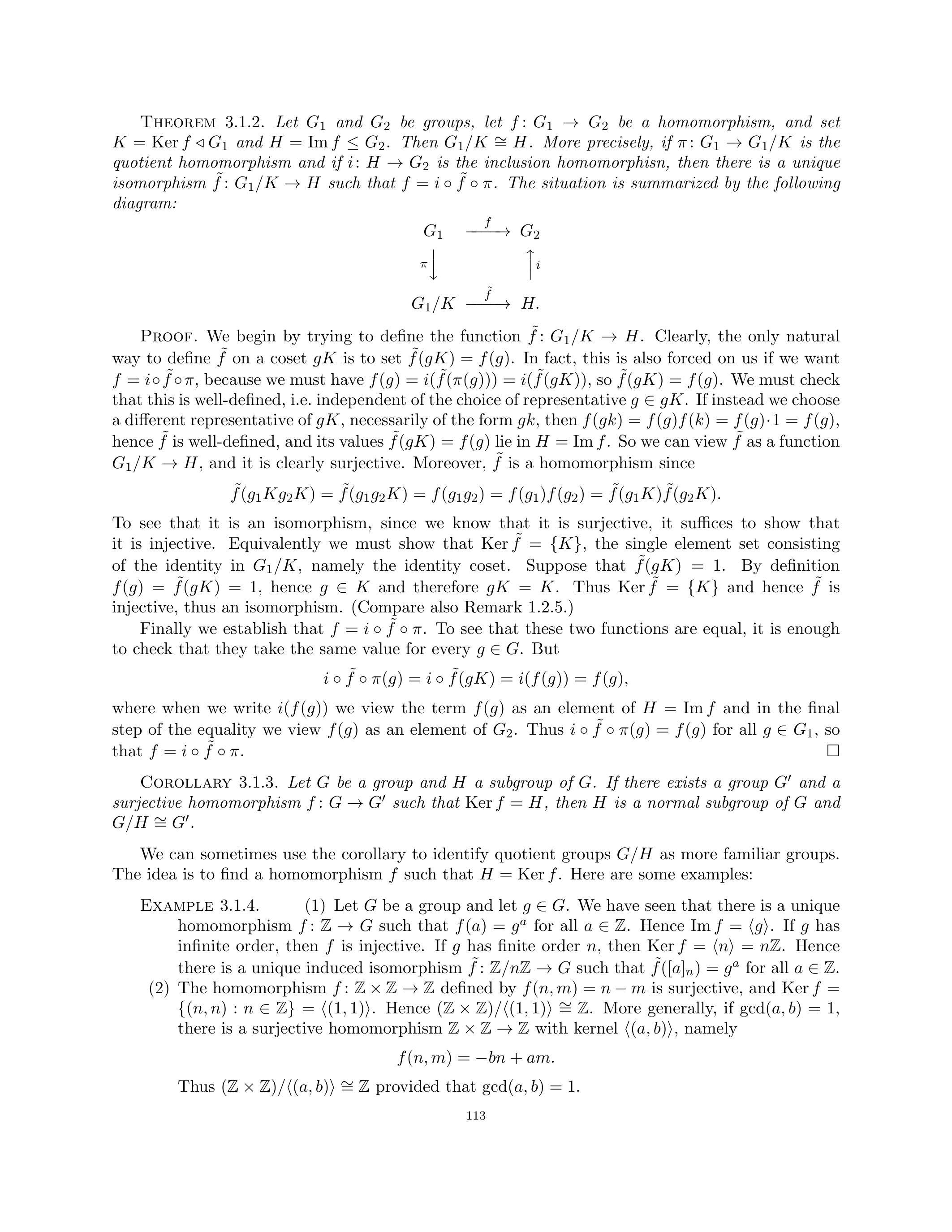 定理 3.1.2. Let $G_{1}$ and $G_{2}$ be s, let $f: G_{1} \rightarrow G_{2}$ be a 同态,and set $K=\operatorname{Ker} f \triangleleft G_{1}$ and $H=\operatorname{Im} f \leq G_{2}$。Then $G_{1} / K \cong H$。More precisely, if $\pi: G_{1} \rightarrow G_{1} / K$ is the 商同态 and if $i: H \rightarrow G_{2}$ is the 包含同态,then there is a unique 同构 $\tilde{f}: G_{1} / K \rightarrow H$ such that $f=i \circ \tilde{f} \circ \pi$。The situation is summarized by the following 图示: