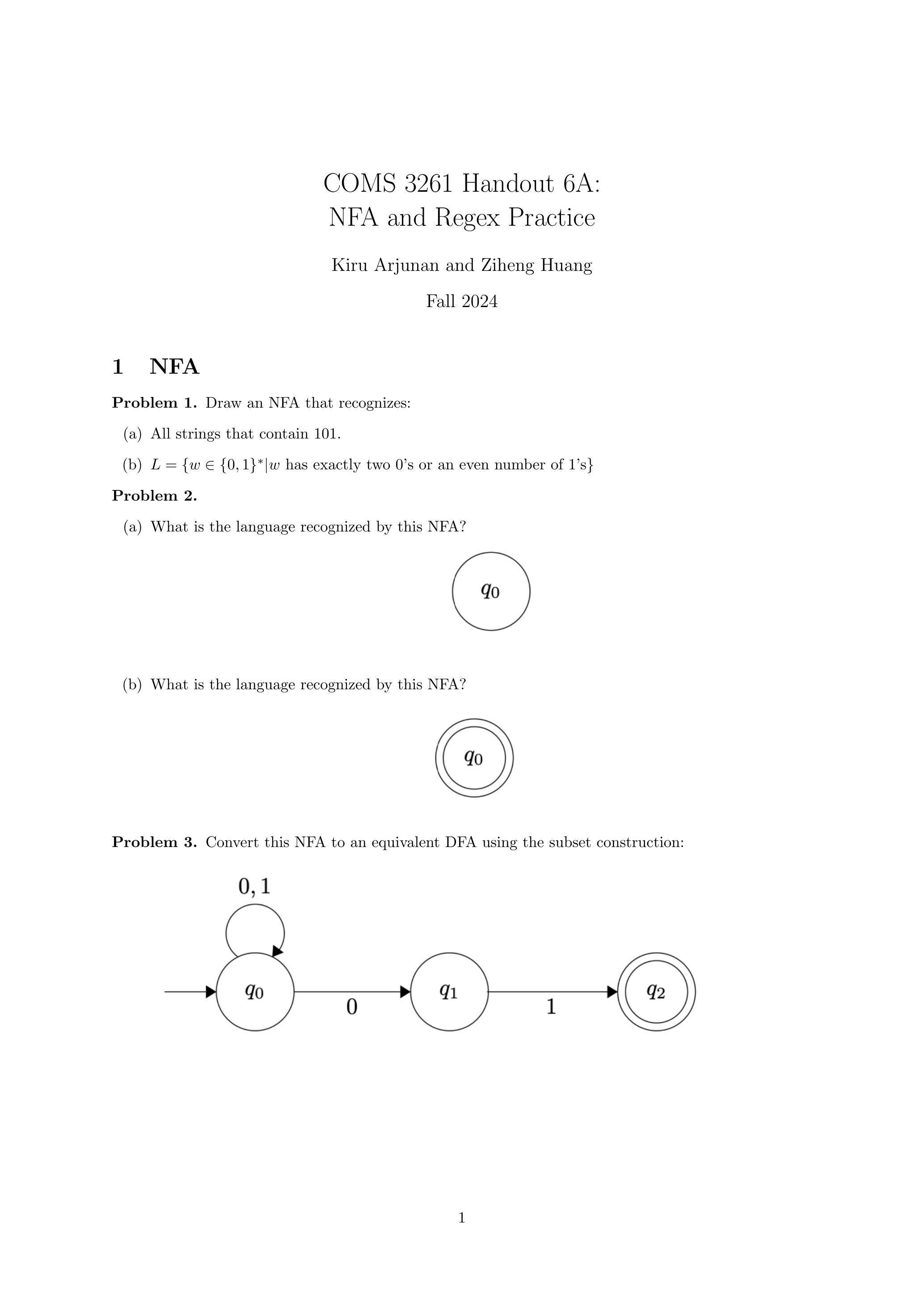 可以把这看作一本书的封面,告诉你这本书叫什么名字(NFA和正则表达式练习),是哪个系列丛书的一部分(COMS 3261 讲义 6A),作者是谁,以及出版年份。