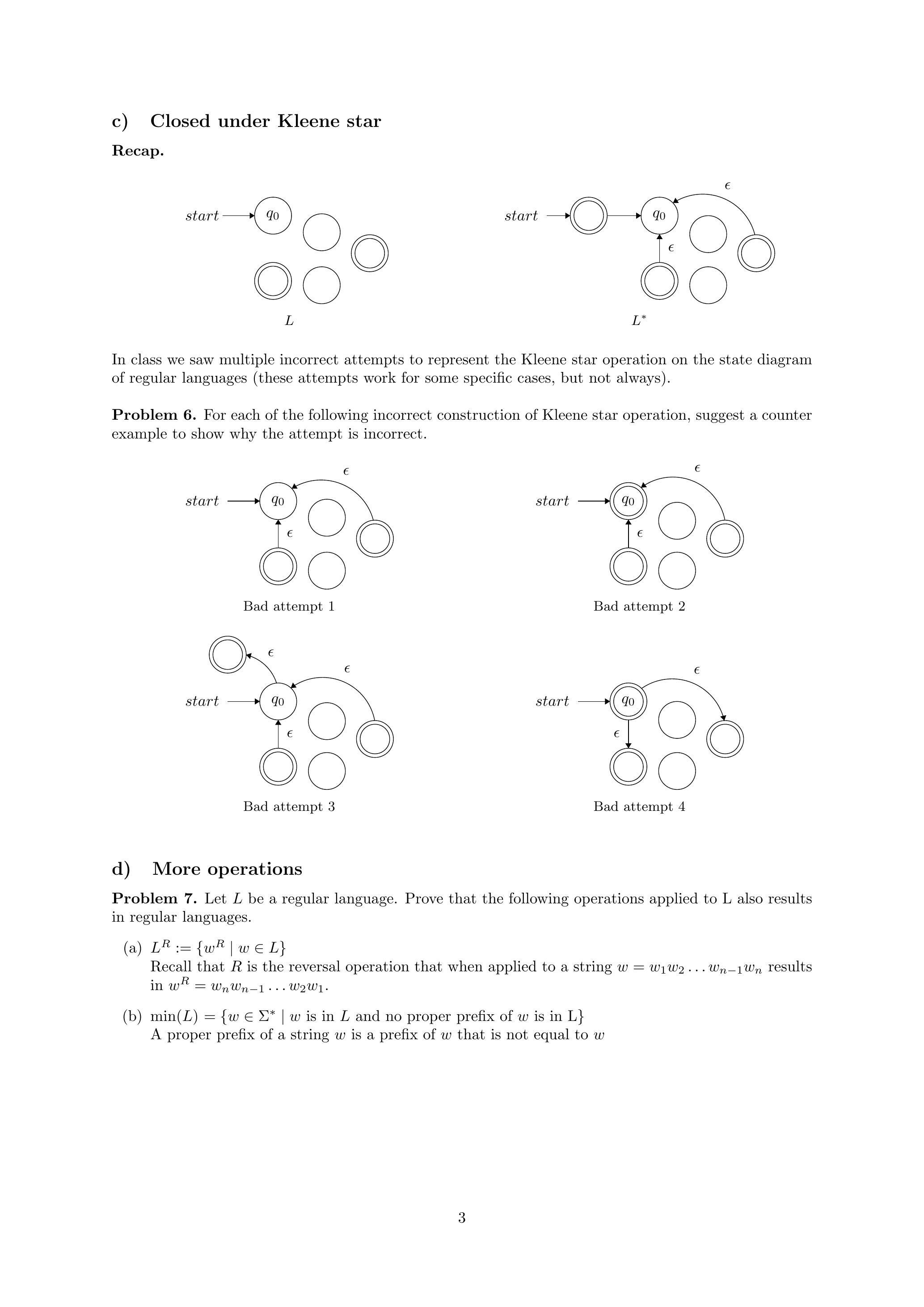 - 构造 $0^*$ (星号): 创建新起始/接受态 $S_0$。$S_0 \xrightarrow{\epsilon} q_5$, $q_6 \xrightarrow{\epsilon} S_0$。