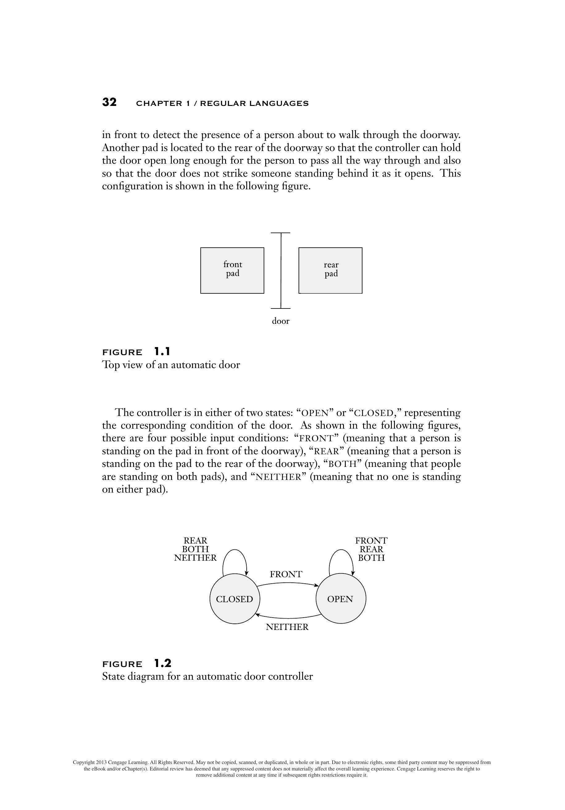 自动门控制器视为有限自动机是有用的,因为它提示了如图 1.2 和 1.3 所示的标准表示方法。这个控制器是一个只有一位内存的计算机,能够记录控制器处于哪两种状态。其他常见设备拥有内存稍大的控制器。在电梯控制器中,一个状态可能代表电梯所在的楼层,输入可能是从按钮接收到的信号。这个计算机可能需要几位来跟踪这些信息。各种家用电器(如洗碗机电子恒温器)以及数字手表计算器的某些部件的控制器,是具有有限内存的计算机的其他例子。这些设备的设计需要牢记有限自动机的方法论和术语。