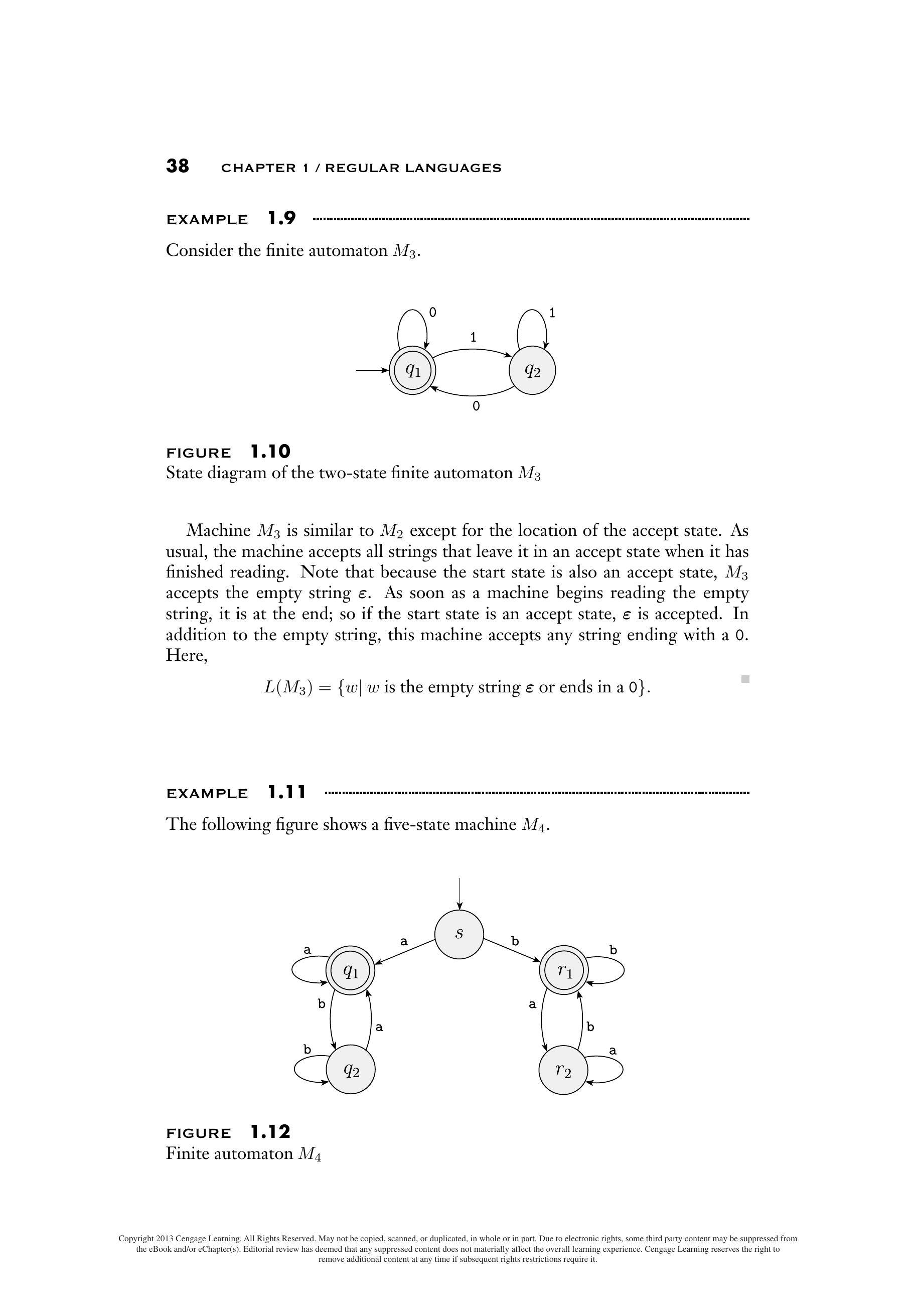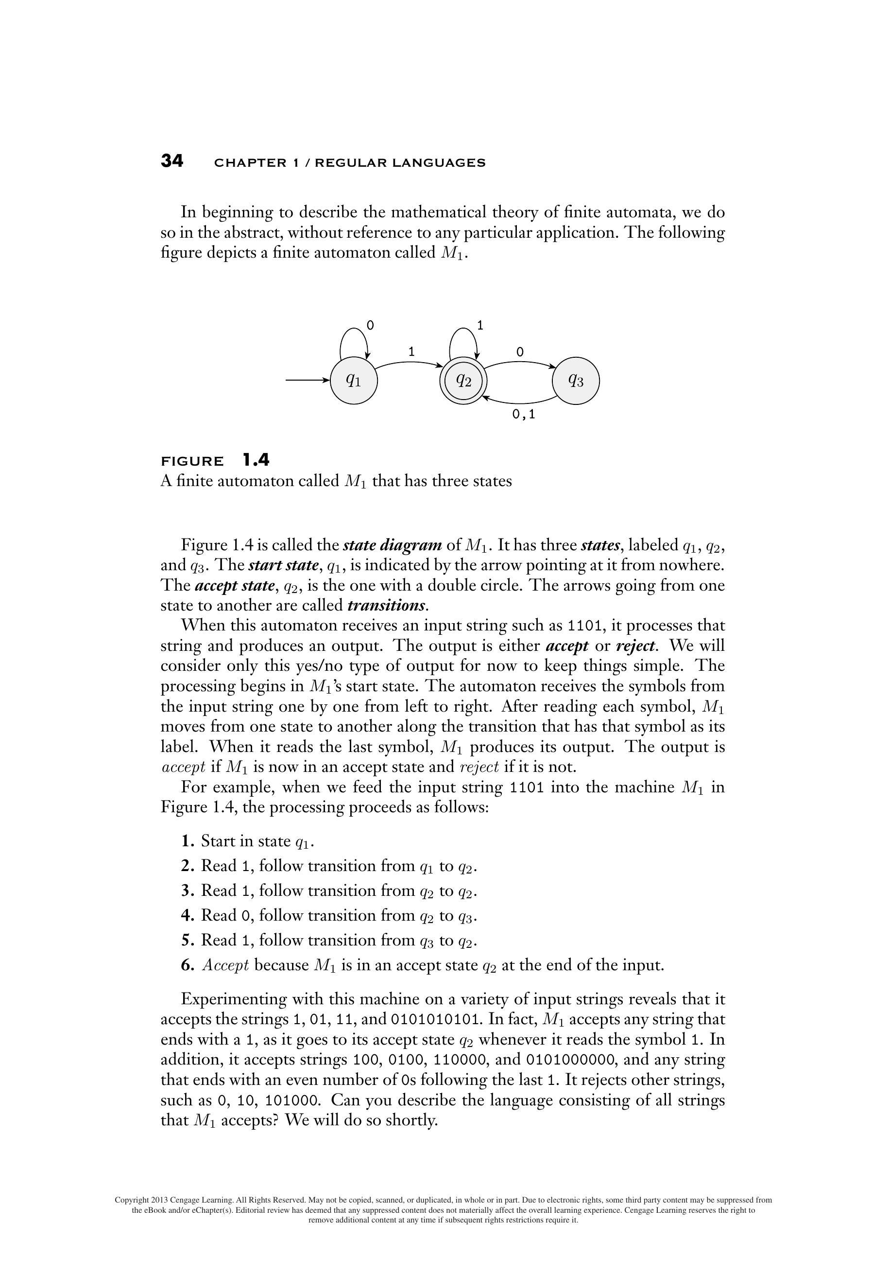 例如,当我们将输入串 1101 输入到图 1.4 中的机器 $M_{1}$ 时,处理过程如下: