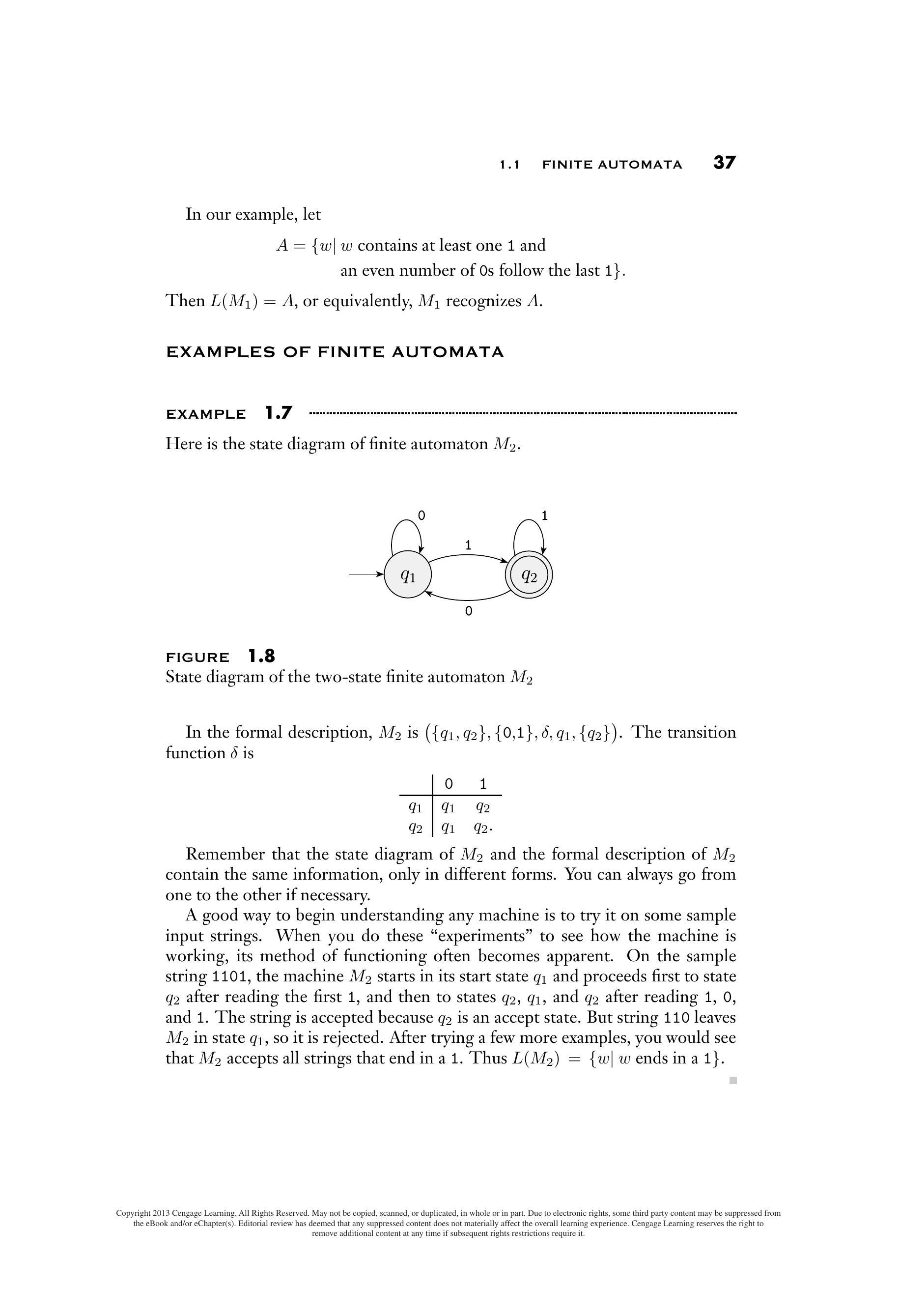 理解任何机器的一个好方法是尝试一些示例输入串。当您进行这些“实验”以查看机器如何工作时,其工作方式通常会变得明显。在示例串 1101 上,机器 $M_{2}$ 从其起始状态 $q_{1}$ 开始,读取第一个 1 后首先进入状态 $q_{2}$,然后读取 1、0 和 1 后进入状态 $q_{2}、q_{1}$$q_{2}$。该接受,因为 $q_{2}$ 是一个接受状态。但 110 使 $M_{2}$ 停留在状态 $q_{1}$,因此被拒绝。在尝试更多例子后,您会发现 $M_{2}$ 接受所有以 1 结尾的。因此 $L\left(M_{2}\right)=\{w \mid w \text { 以 1 结尾}\}$