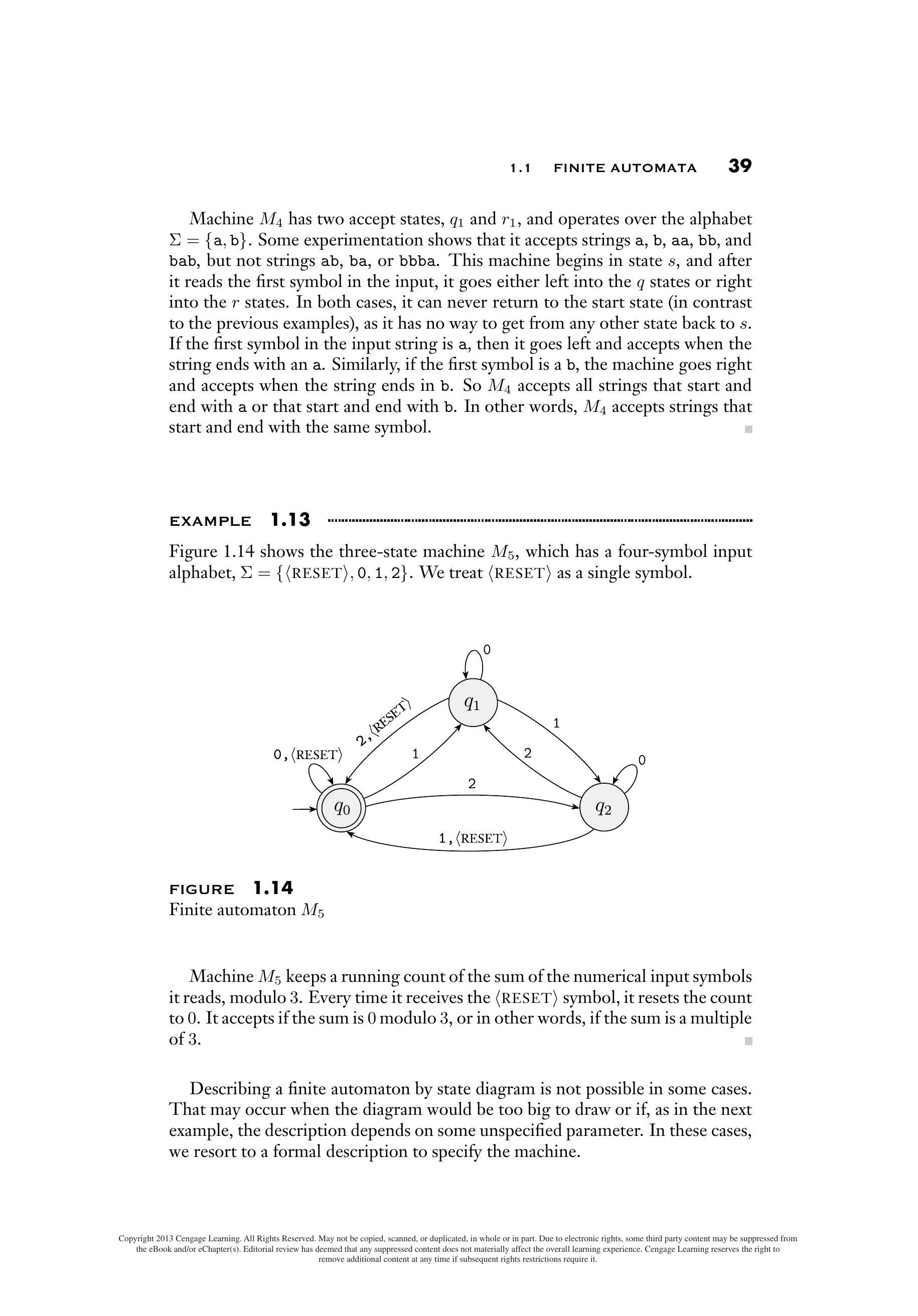 图 1.14 显示了三状态机器 $M_{5}$,它有一个四符号输入字母表$\Sigma=\{\langle$ RESET $\rangle, 0,1,2\}$。我们将 $\langle$ RESET $\rangle$ 视为一个单一符号