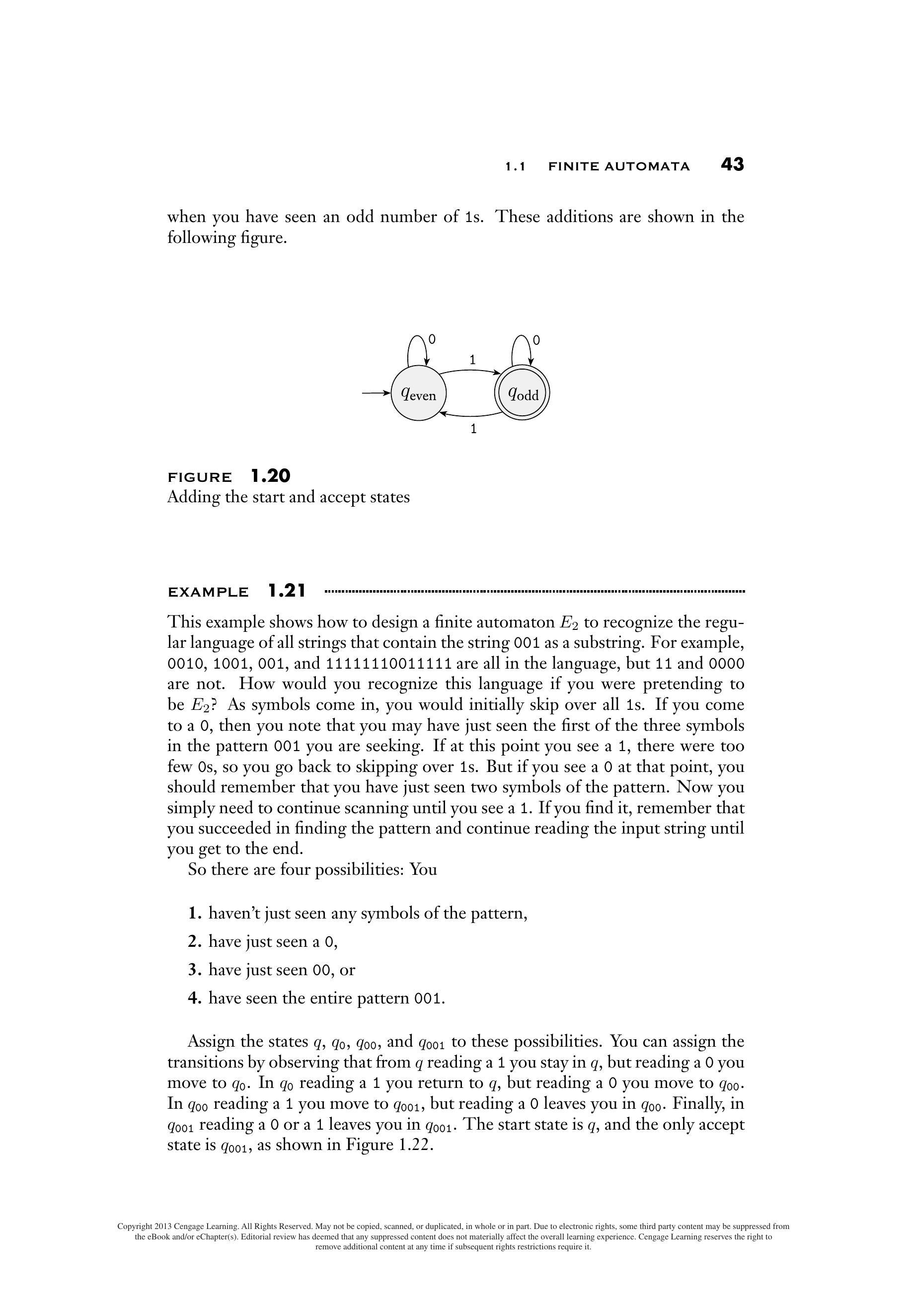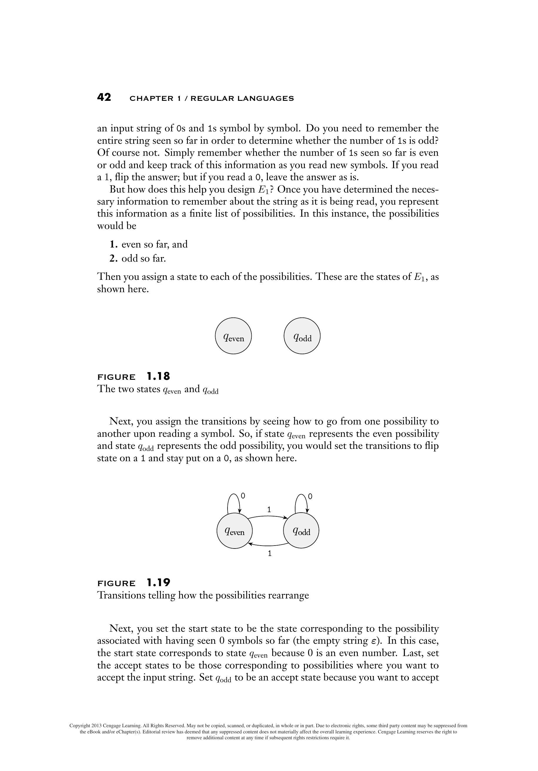 例如,假设字母表$\{0,1\}$,并且语言由所有包含奇数个 1 的组成。您想构建一个有限自动机 $E_{1}$识别这种语言。假装是自动机,您开始逐个符号接收由 0 和 1 组成的输入串。您需要记住到目前为止所看到的整个,以便确定 1 的数量是奇数还是偶数吗?当然不需要。只需记住到目前为止所看到的 1 的数量是偶数还是奇数,并在读取新符号时跟踪这些信息。如果您读取 1,翻转答案;但如果您读取 0,保持答案不变。