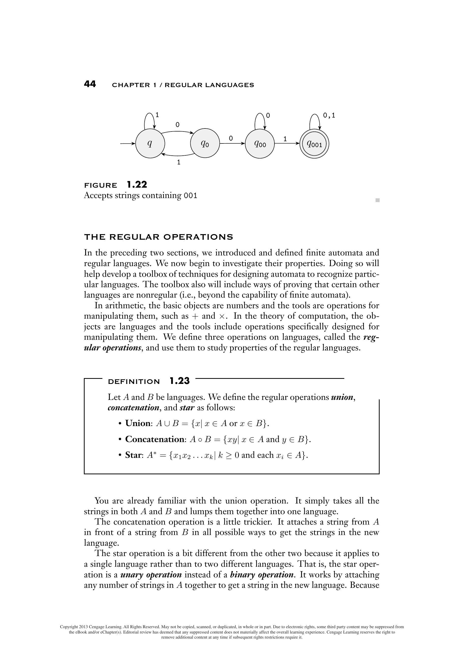 算术中,基本对象数字,而工具是用于操作它们的运算,例如 + 和 $\times$。在计算理论中,对象语言,而工具包括专门用于操作它们的运算。我们定义语言上的三种运算,称为正则运算,并使用它们来研究正则语言性质