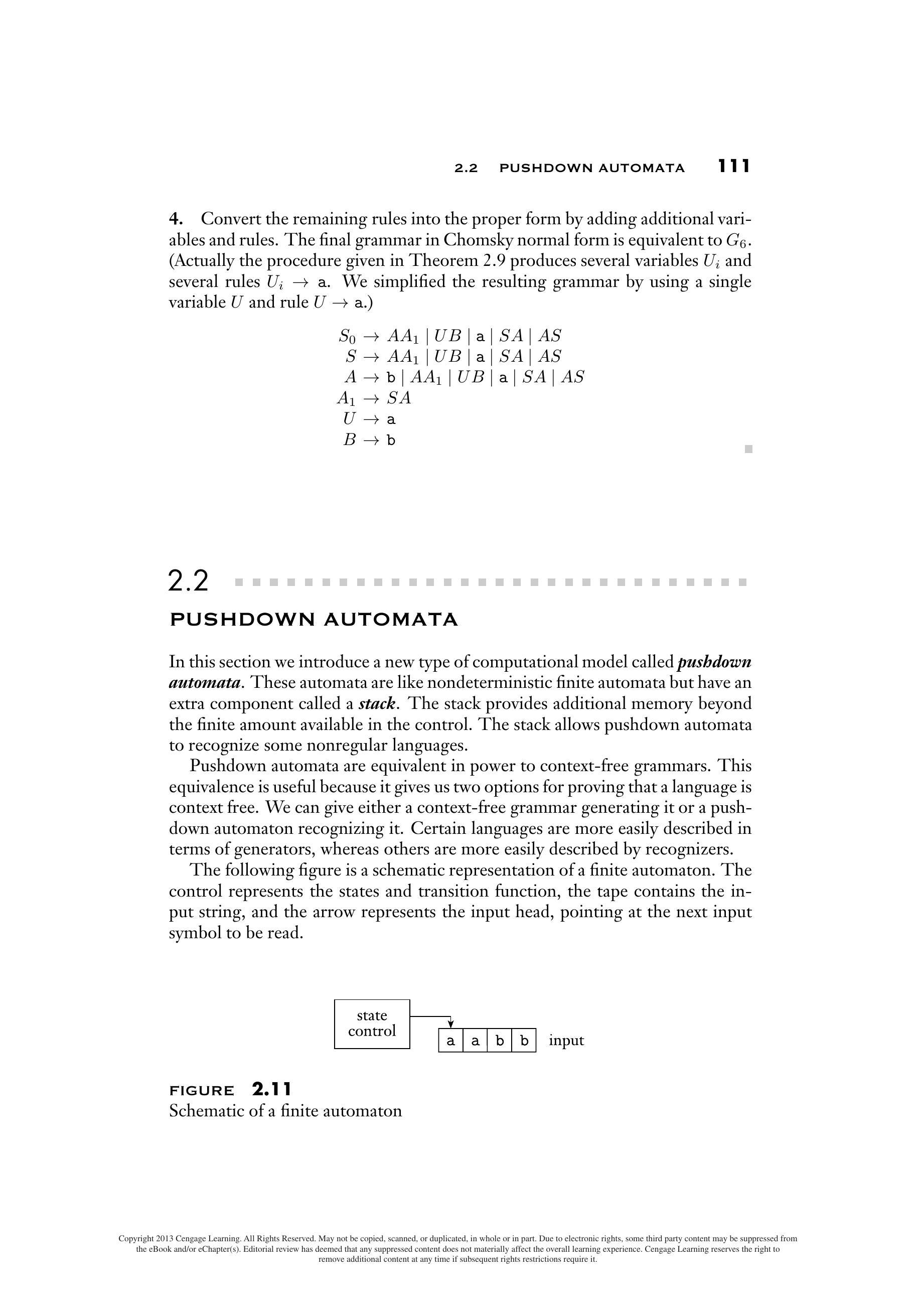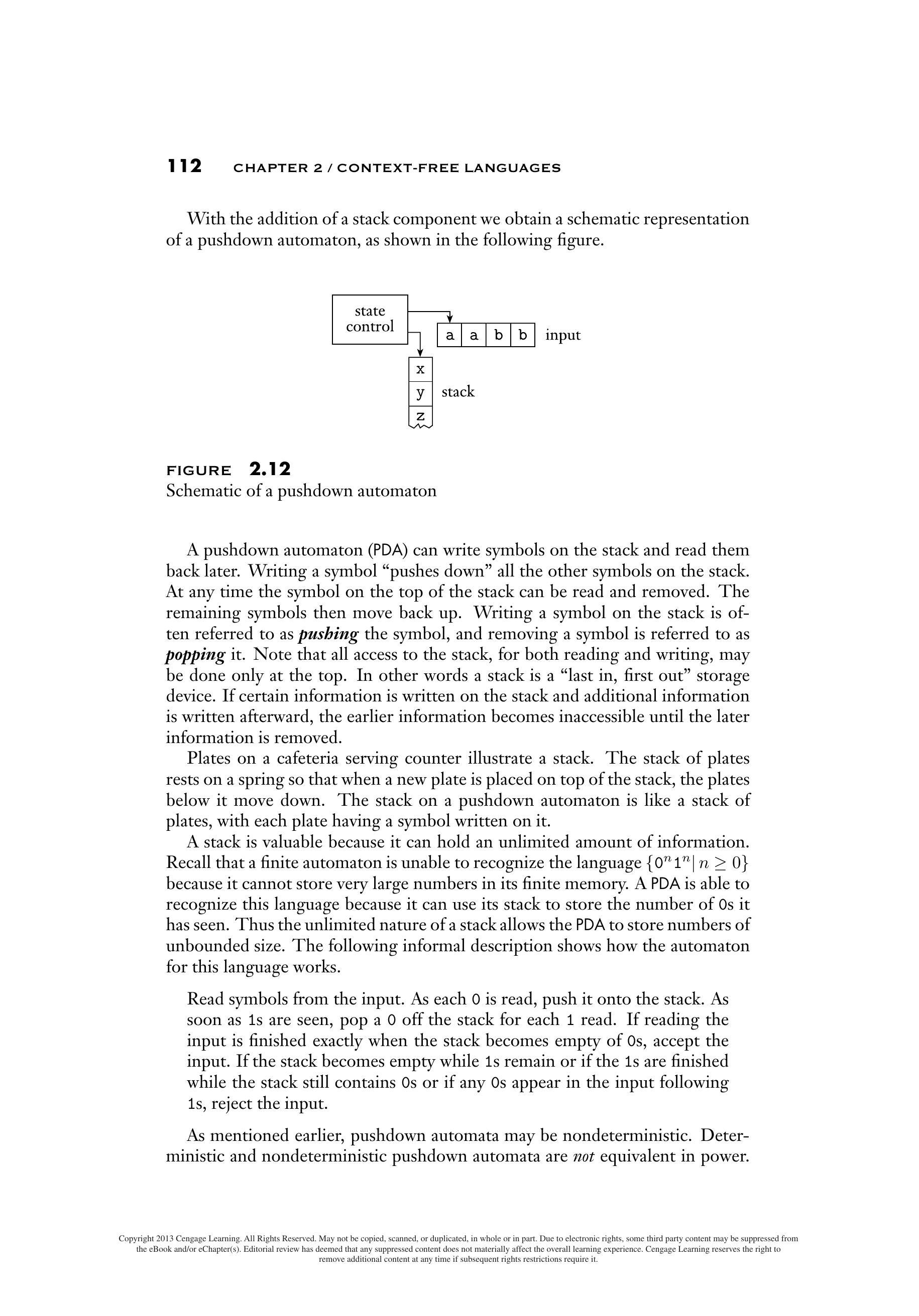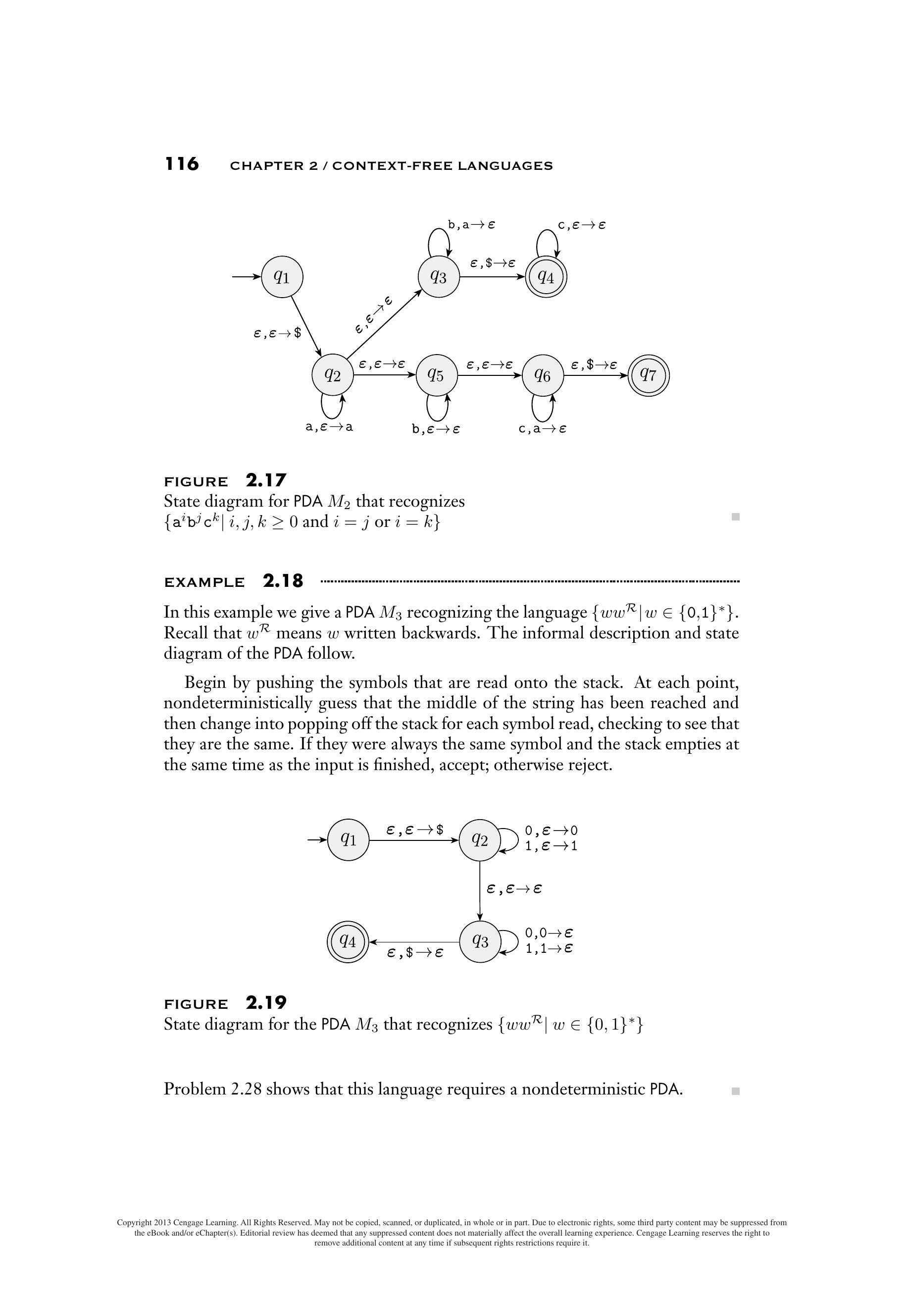 确定性下推自动机识别某些语言,这是任何确定性下推自动机都无法识别的,我们将在 2.4 节中看到。我们在示例 2.16 和 2.18 中给出了需要非确定性语言。回想一下,确定性和非确定性有限自动机确实识别同一类语言,因此下推自动机的情况是不同的。我们关注非确定性下推自动机,因为这些自动机在能力上与上下文无关文法等价。