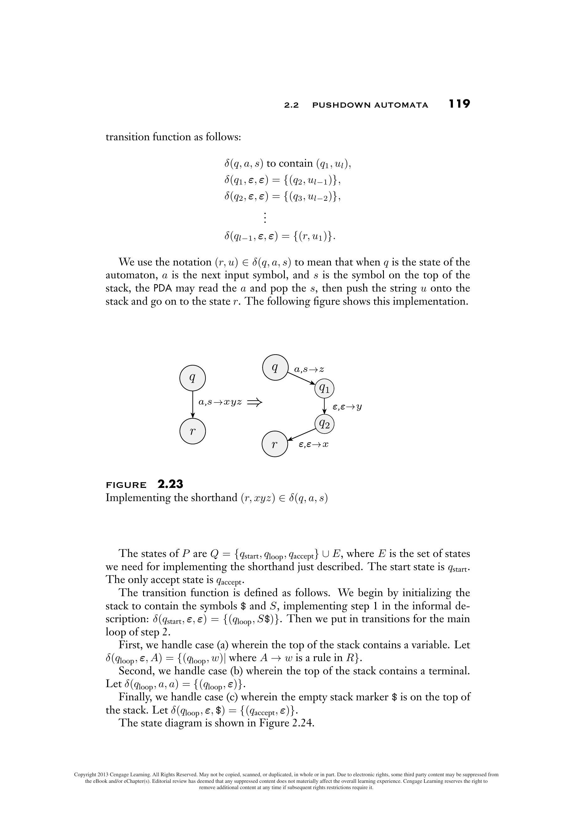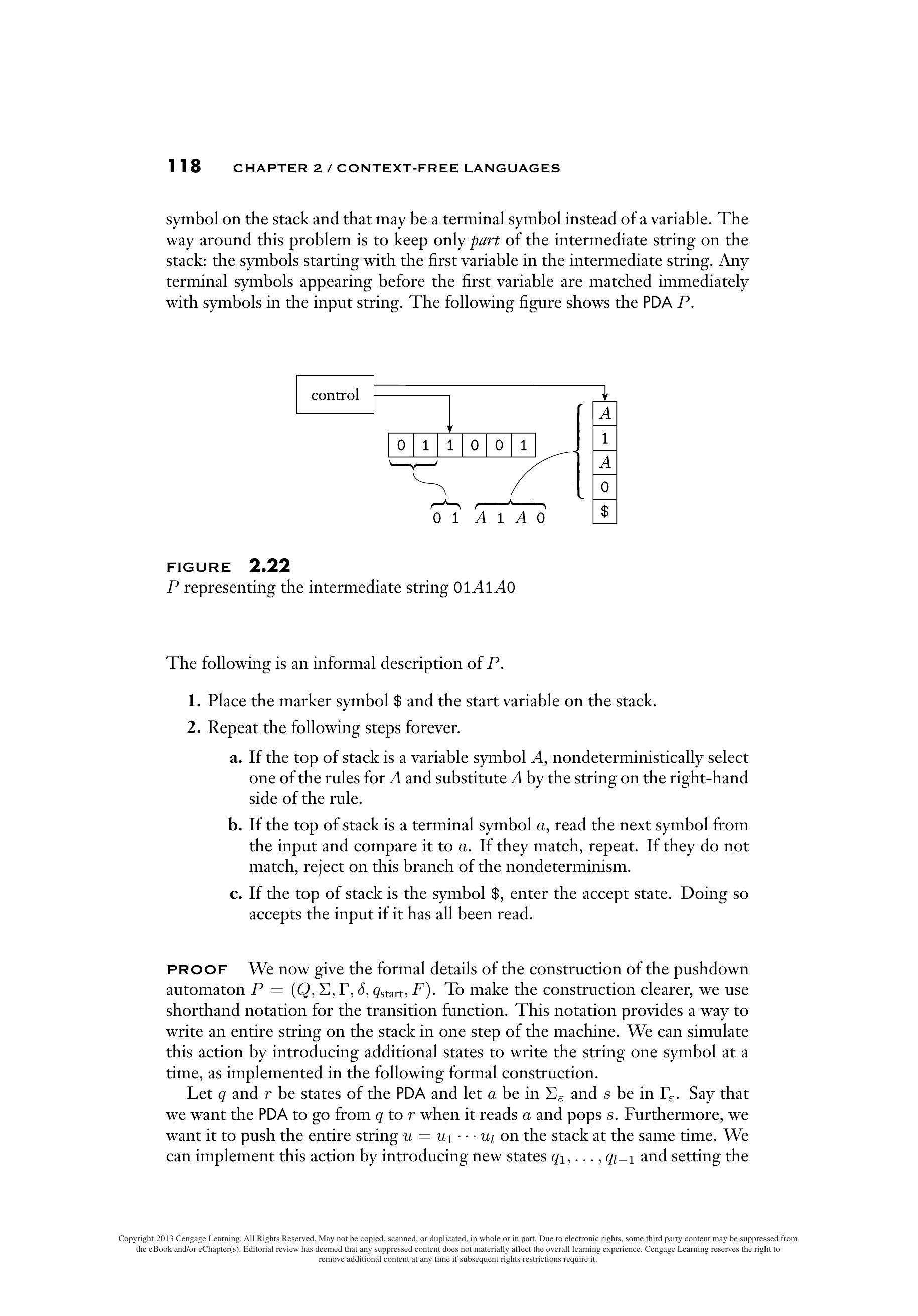 证明 我们现在给出下推自动机 $P=\left(Q, \Sigma, \Gamma, \delta, q_{\text {start }}, F\right)$ 构造的形式细节。为了使构造更清晰,我们使用转移函数的简写表示法。这种表示法提供了一种在机器的一个步骤中将整个字符串写入的方法。我们可以通过引入额外的状态来模拟此操作,以便一次写入一个符号,如下面的形式构造所示。