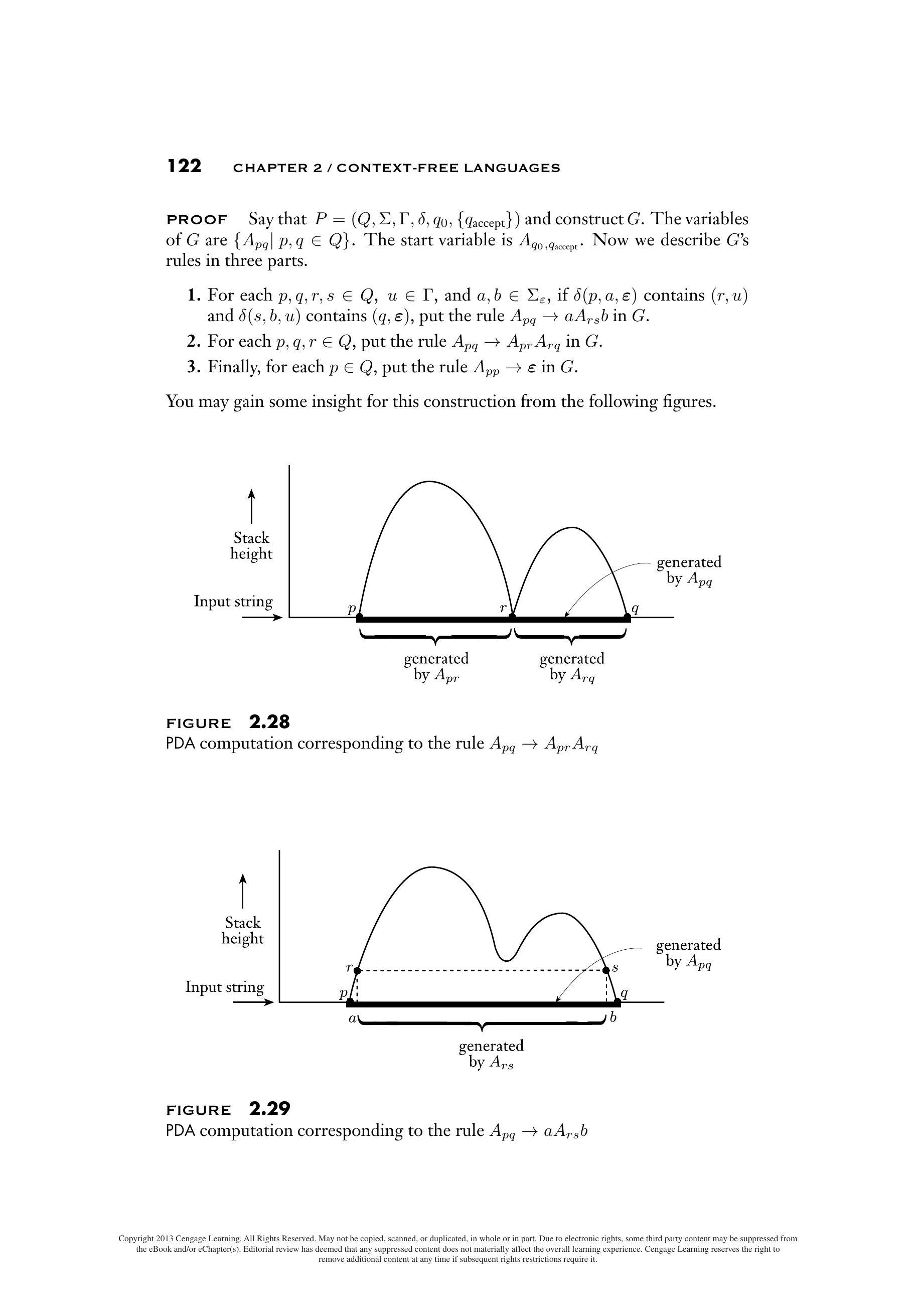 在第二种情况下,考虑 $x$ 中由 $A_{p r}$$A_{r q}$ 分别生成的部分 $y$$z$,因此 $x=y z$。因为 $A_{p r} \stackrel{*}{\Rightarrow} y$ 在至多 $k$ 步内,并且 $A_{r q} \stackrel{*}{\Rightarrow} z$ 在至多 $k$ 步内,归纳假设告诉我们 $y$ 可以将 $P$$p$ 带到 $r$,并且 $z$ 可以将 $P$$r$ 带到 $q$,并在开始和结束时清空。因此 $x$ 可以将其从 $p$(空)带到 $q$(空)。这完成了归纳步骤。