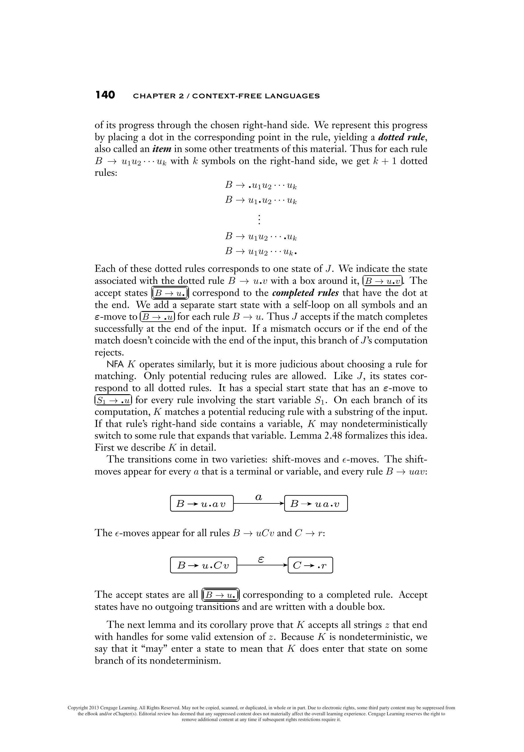 每个带点规则对应于 $J$ 的一个状态。我们用方框 $B \rightarrow u . v$ 表示与带点规则 $B \rightarrow u . v$ 关联的状态。接受状态 $B \rightarrow u$. 对应于末尾有点的已完成规则。我们添加一个单独的开始状态,该状态对所有符号具有自环,并对每个规则 $B \rightarrow u$ 具有到 $B \rightarrow . u$ 的 $\varepsilon$ 移动。因此,如果匹配在输入结束时成功完成,$J$ 则接受。如果发生不匹配,或者匹配的结束与输入的结束不一致,则 $J$ 的此计算分支拒绝。