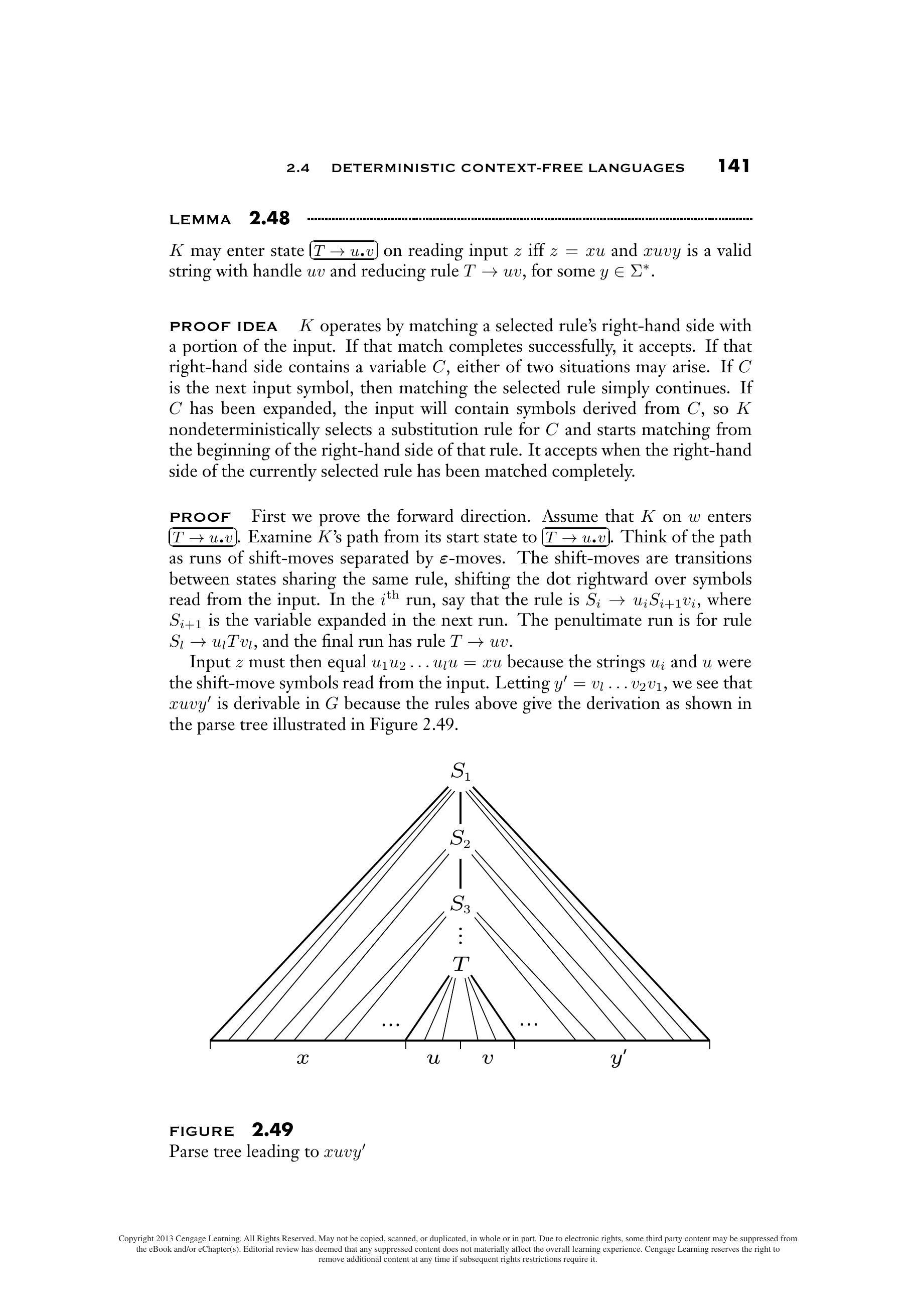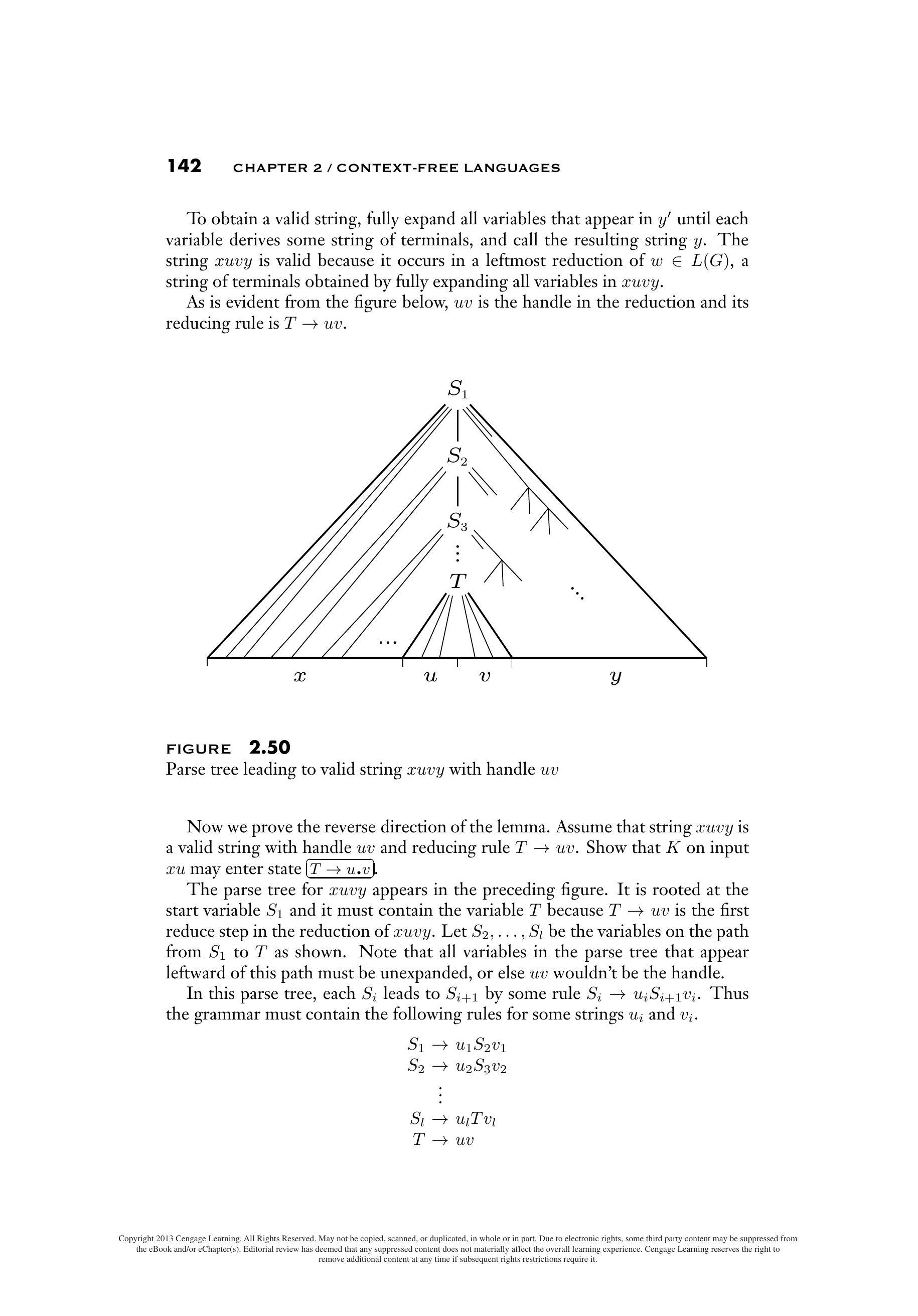 $xuvy$ 的分析树显示在前面的图中。它以开始变量 $S_1$ 为根,并且必须包含变量 $T$,因为 $T \rightarrow uv$ 是 $xuvy$ 归约中的第一个规约步骤。令 $S_2, \ldots, S_l$ 为从 $S_1$ 到 $T$ 路径上的变量,如图所示。请注意,分析树中出现在此路径左侧的所有变量都必须未展开,否则 $uv$ 就不会是句柄。