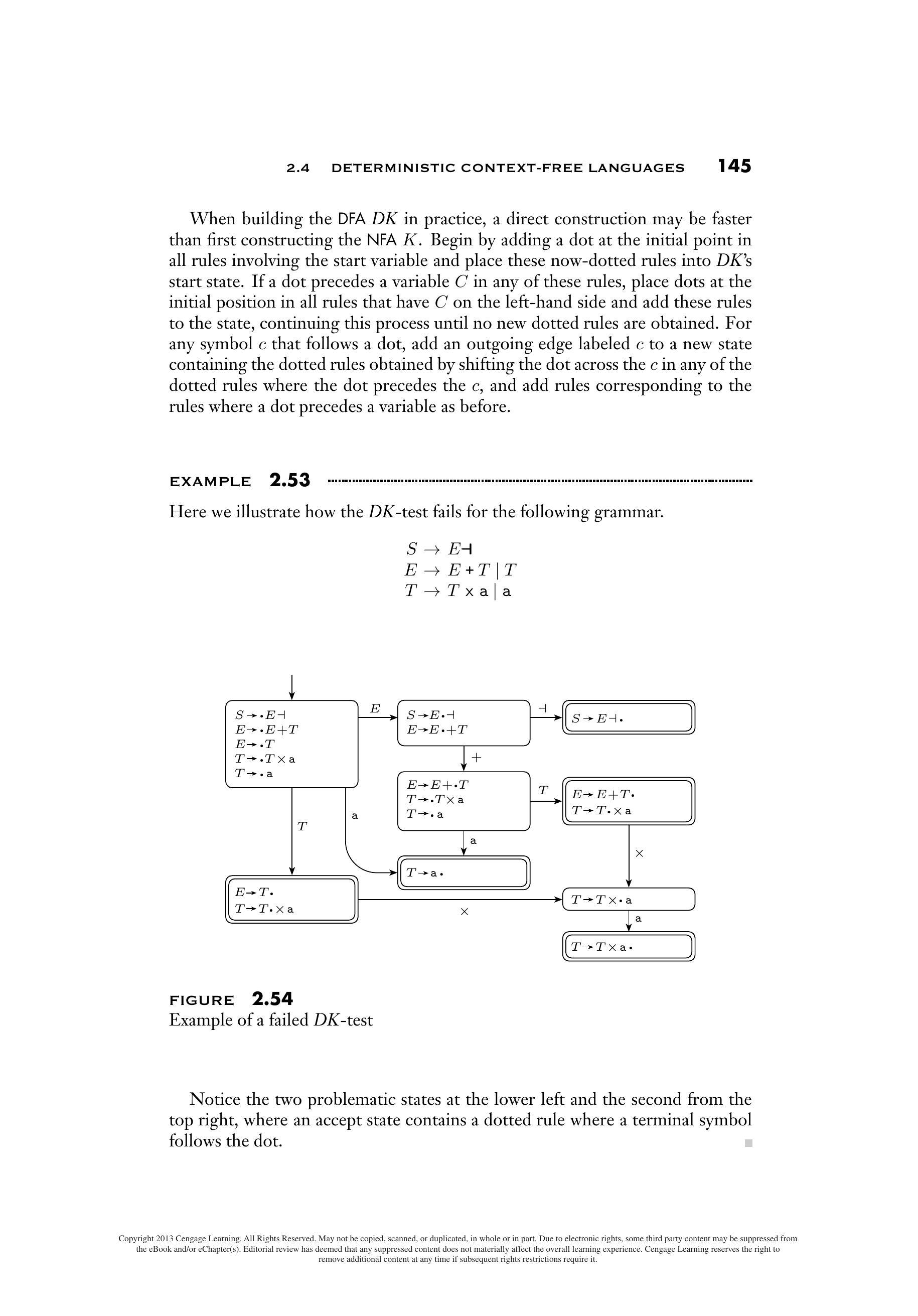 最后,我们通过在第 55 页的定理 1.39 的证明中使用子集构造将 NFA $K$ 转换为 DFA $DK$,然后删除所有从开始状态无法到达的状态。因此,$DK$ 的每个状态都包含一个或多个带点规则。每个接受状态都包含至少一个已完成的规则。我们可以通过引用包含所示带点规则的状态来将引理 2.48 和推论 2.51 应用于 $DK$。
