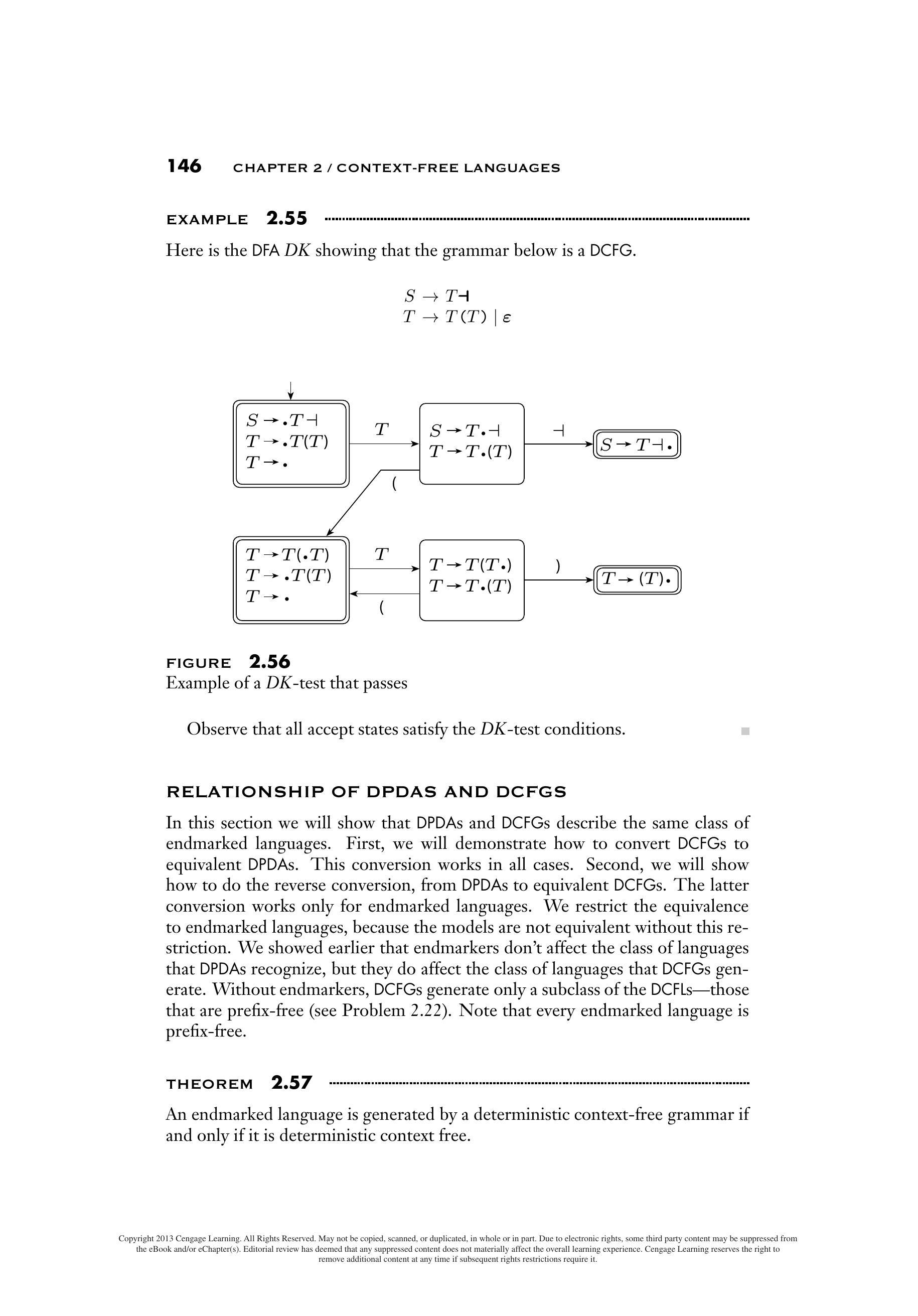证明思路 我们将证明 DK 检验通过当且仅当所有句柄都是强制的。等价地,检验失败当且仅当某个句柄不是强制的。首先,假设某个有效字符串具有非强制句柄。如果我们对该字符串运行 $DK$,推论 2.51 说 $DK$ 在句柄结束时进入接受状态。DK 检验失败,因为该接受状态要么具有第二个已完成规则,要么具有导致接受状态的出边,其中出边以终结符号开头。在后一种情况下,接受状态将包含一个点后跟着终结符号的带点规则。