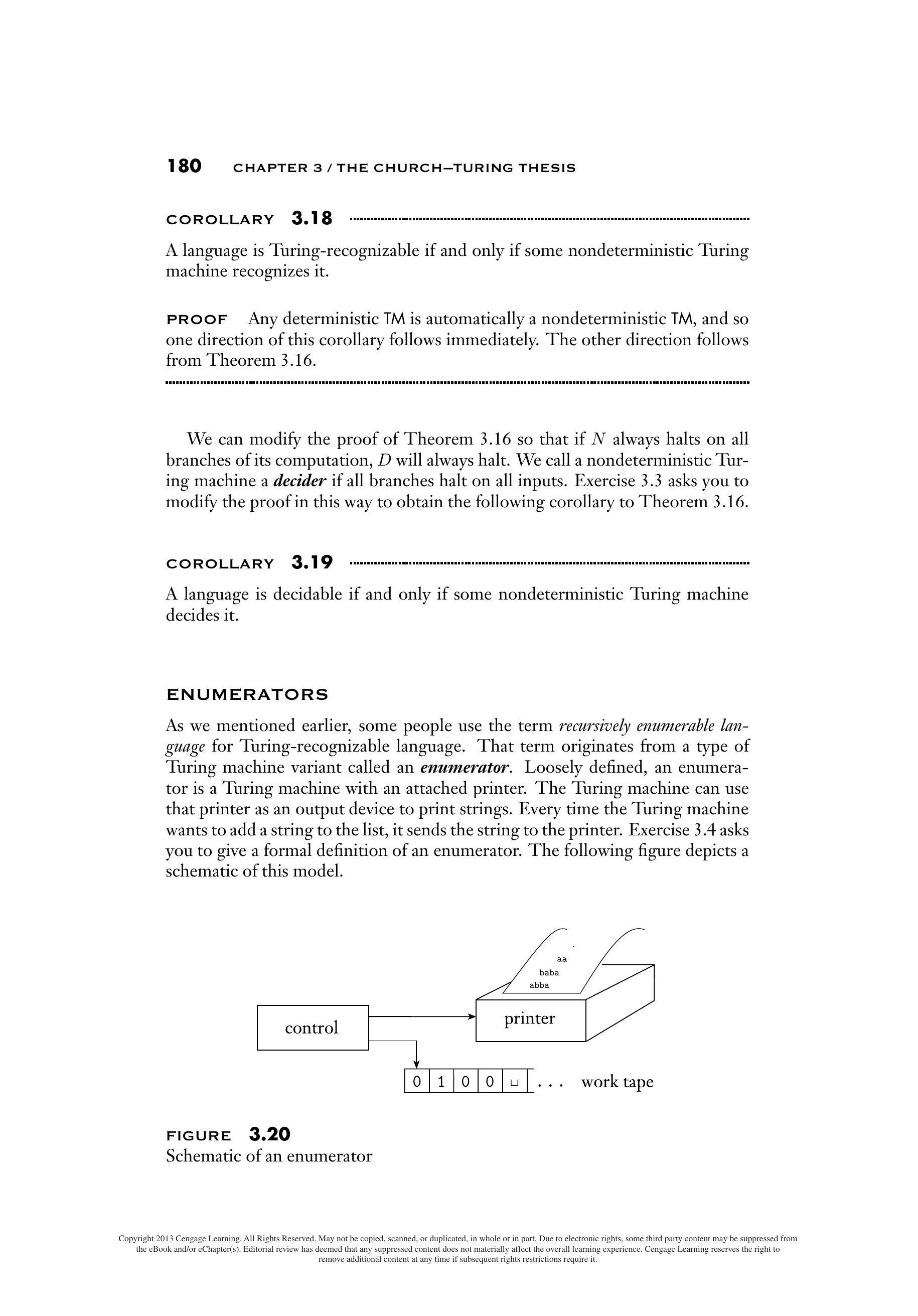 正如我们之前提到的,有些人用递归可枚举语言来指代图灵可识别语言。这个术语起源于一种称为枚举器图灵机变体。广义地讲,枚举器是一种带有打印机的图灵机图灵机可以使用该打印机作为输出设备来打印字符串。每当图灵机想要将一个字符串添加到列表中时,它就会将该字符串发送到打印机。练习 3.4 要求您给出枚举器的正式定义。下图描绘了此模型的示意图。
