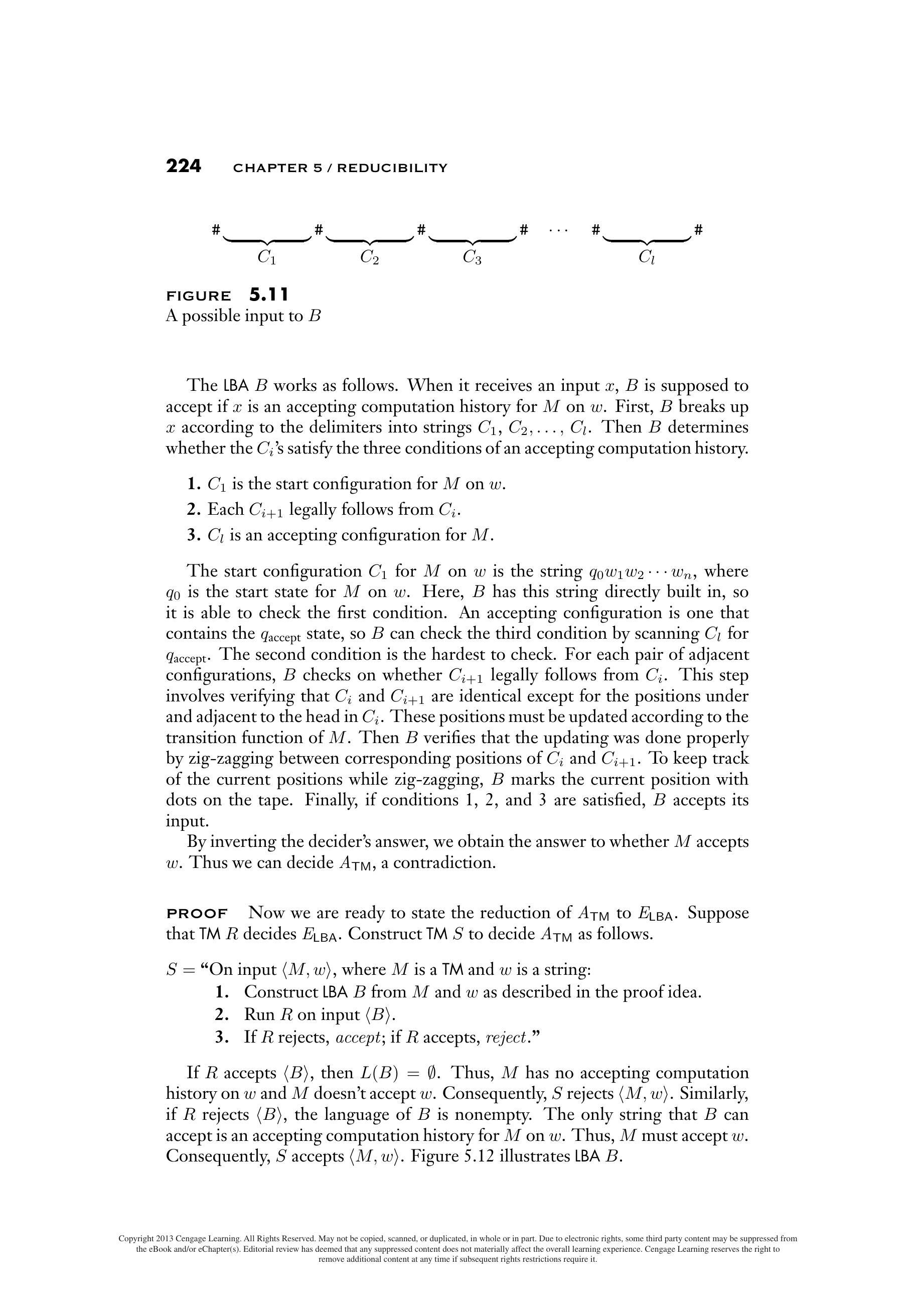 我们构造$B$来接受其输入$x$,如果$x$是$M$在$w$上的接受计算历史。回想一下,接受计算历史是配置序列$C_{1}, C_{2}, \ldots, C_{l}$,这是$M$接受某个字符串$w$时所经历的。出于本证明的目的,我们假设接受计算历史表示为单个字符串,配置之间用#符号分隔,如图5.11所示。