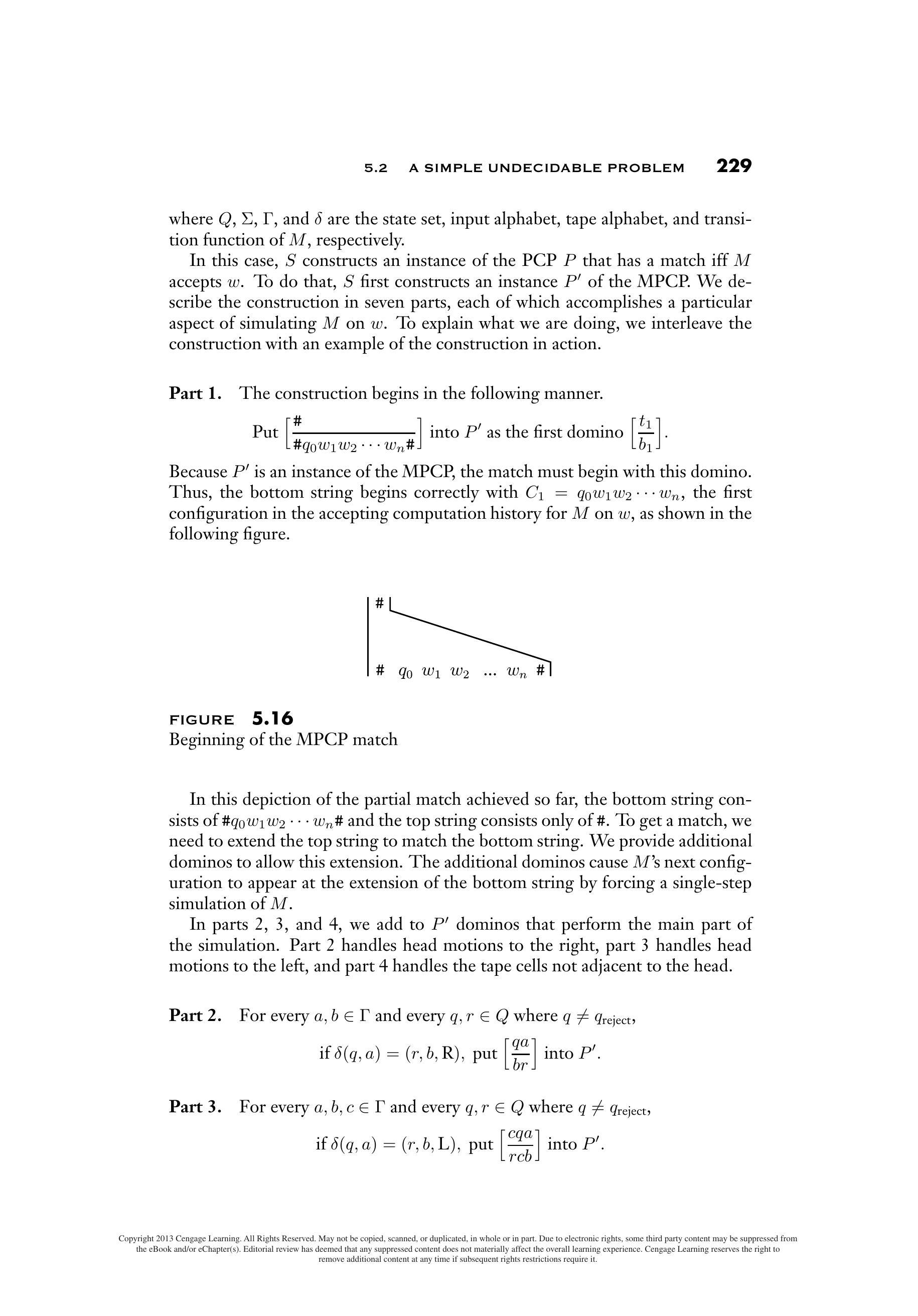 在这种情况下,$S$ 构造 PCP 的一个实例 $P$,当且仅当 $M$ 接受 $w$ 时,该实例才具有匹配。为此,$S$ 首先构造 MPCP 的一个实例 $P^{\prime}$。我们将构造过程分为七个部分,每个部分都完成模拟 $M$$w$ 上的一个特定方面。为了解释我们正在做的事情,我们穿插了构造过程和一个构造实例。