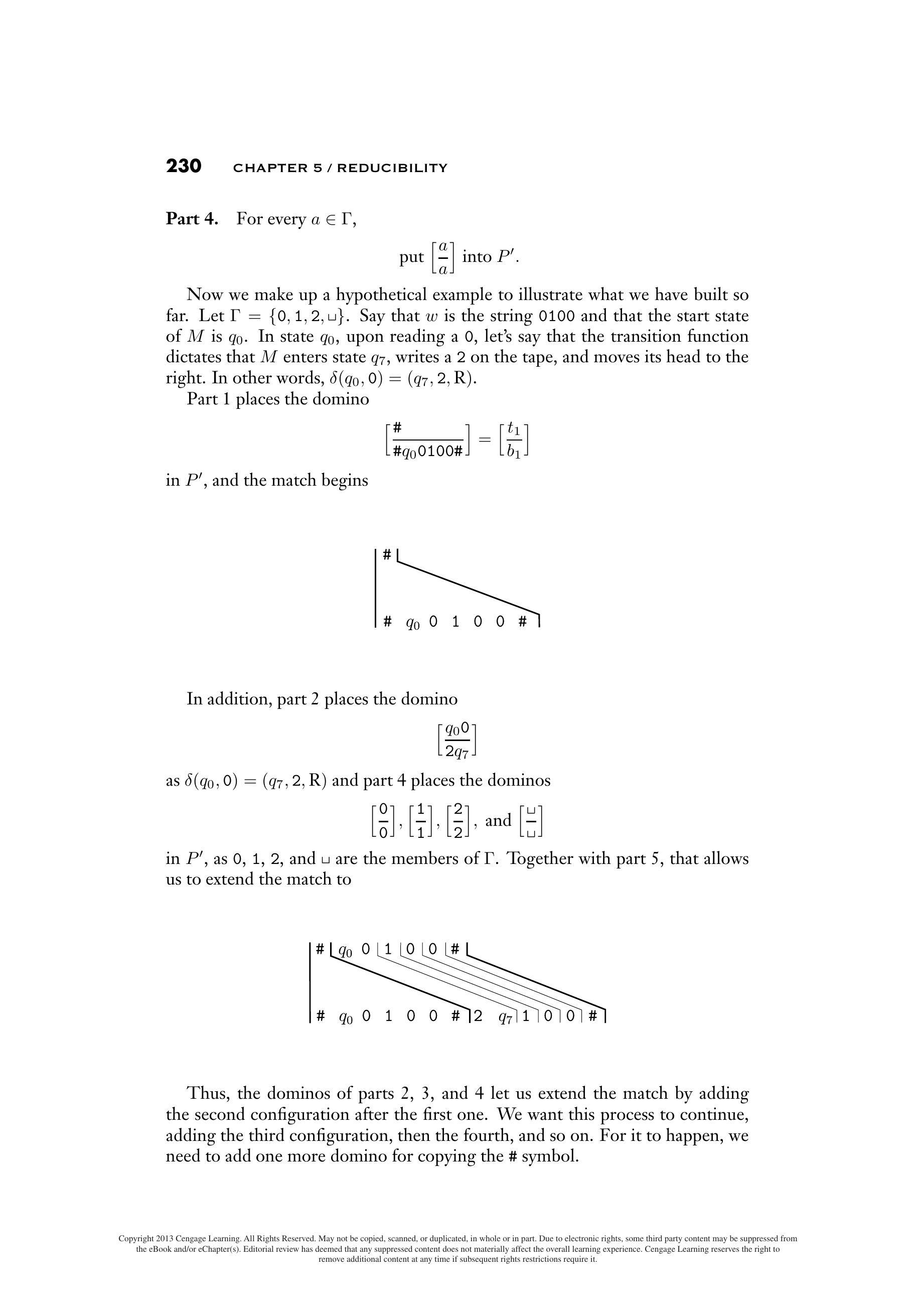 现在我们举一个假设的例子来说明我们目前所构建的内容。令 $\Gamma=\{0,1,2, \sqcup\}$。假设 $w$ 是字符串 $0100$,并且 $M$ 的起始状态$q_{0}$。在状态 $q_{0}$ 中,读取一个 $0$ 后,假设转移函数规定 $M$ 进入状态 $q_{7}$,在纸带上写入一个 $2$,并将磁头向右移动。换句话说,$\delta\left(q_{0}, 0\right)=\left(q_{7}, 2, \mathrm{R}\right)$