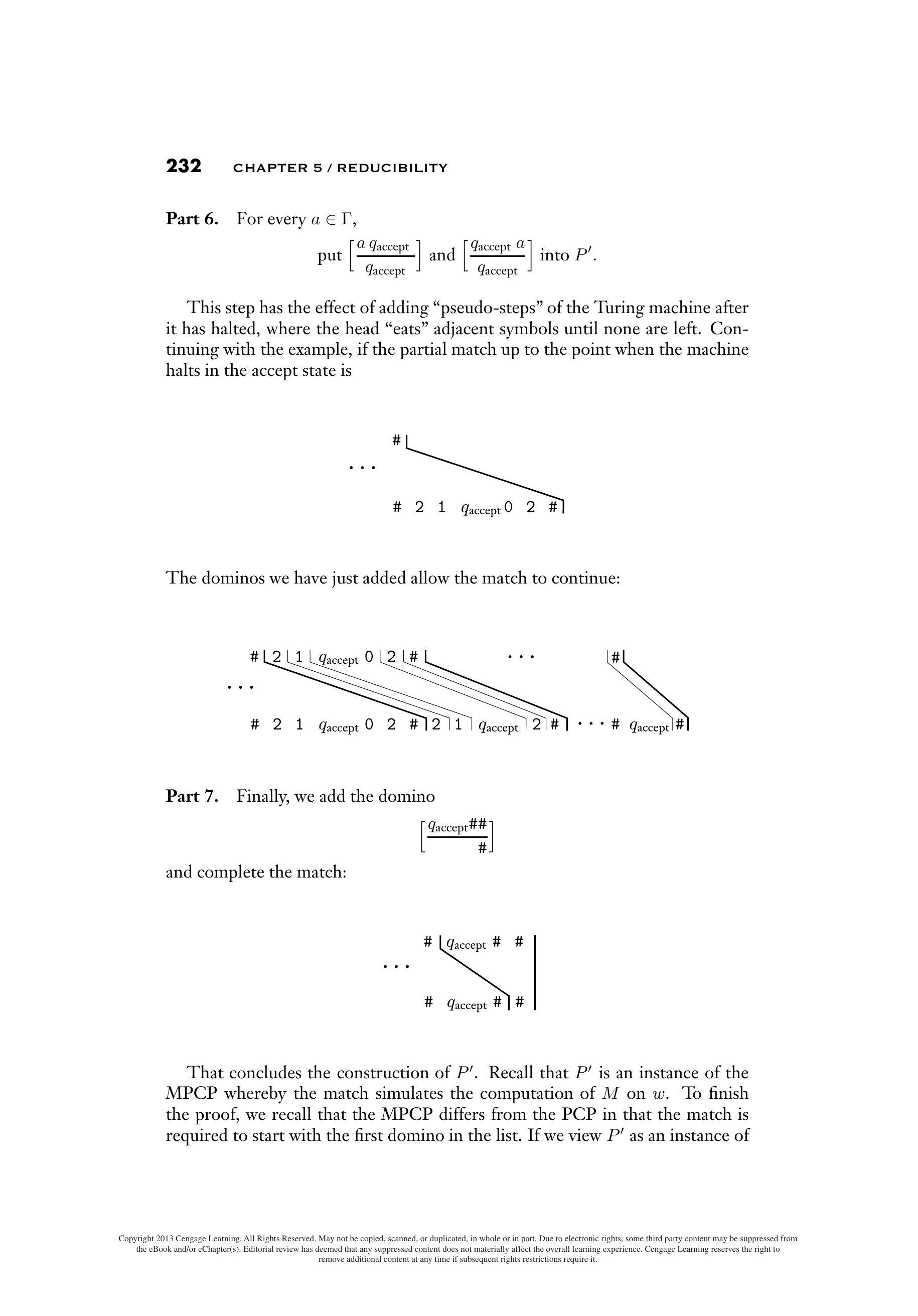 请注意,当我们构造一个匹配时,我们被迫模拟 $M$输入 $w$ 上的行为。这个过程一直持续到 $M$ 达到停机状态。如果出现接受状态,我们希望部分匹配的顶部与底部“赶上”,以便匹配完成。我们可以通过添加额外的多米诺骨牌来安排这种情况。