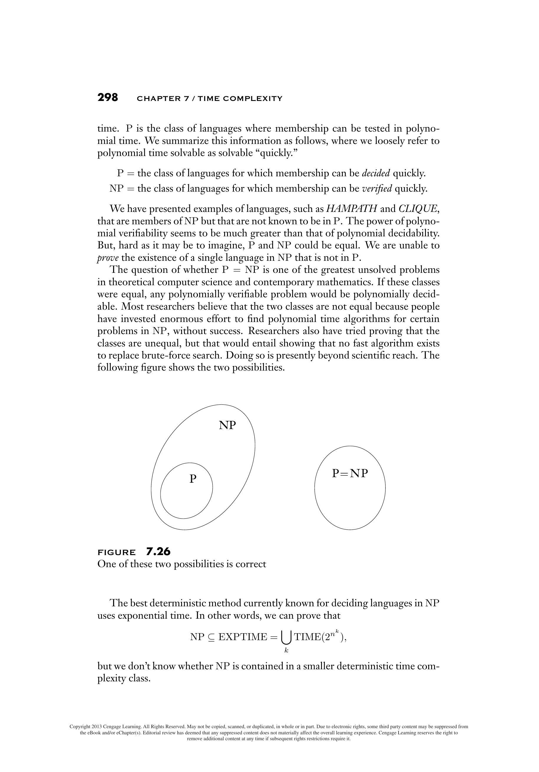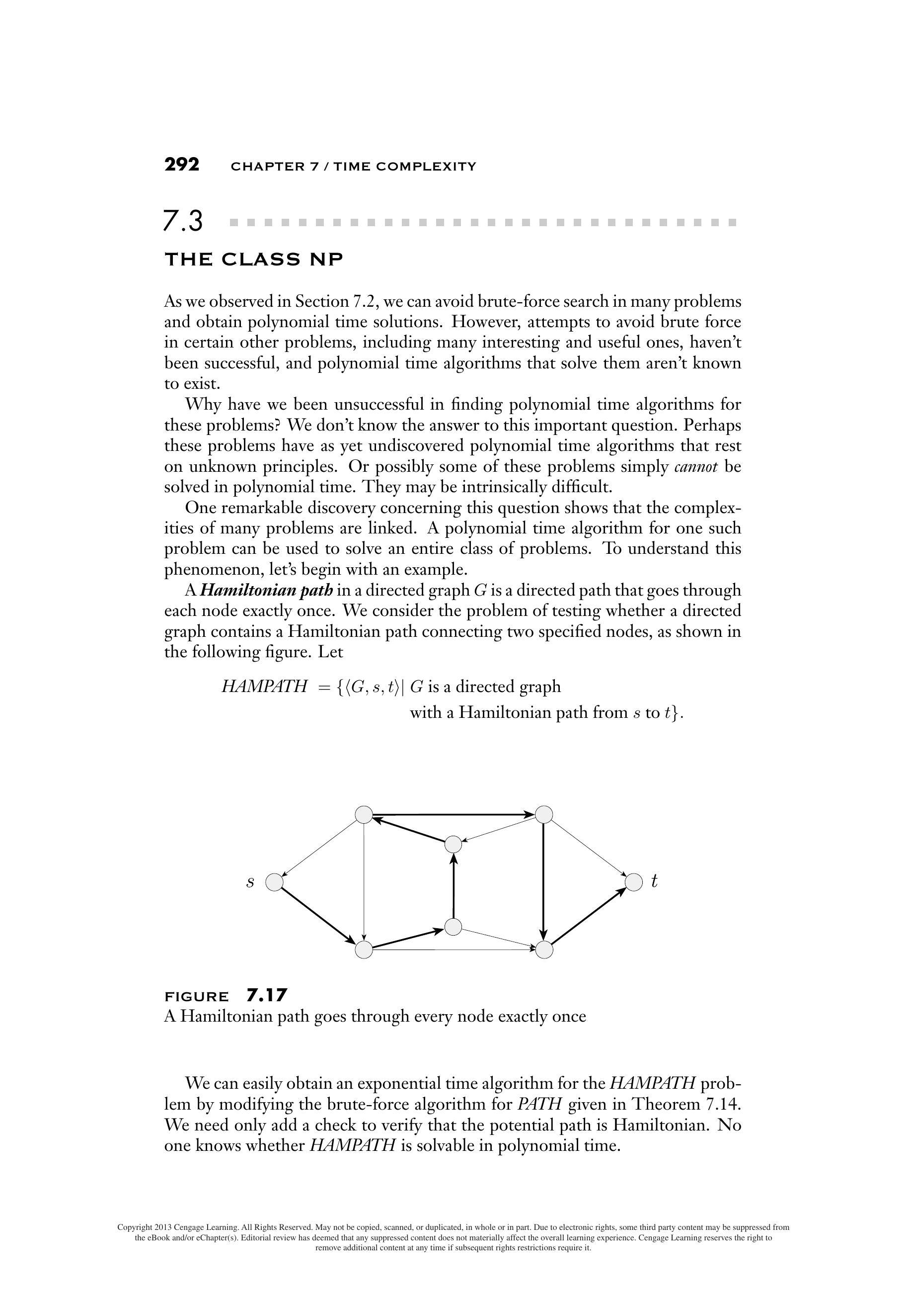 正如我们在7.2节中观察到的,我们可以在许多问题中避免暴力搜索并获得多项式时间解。然而,在某些其他问题(包括许多有趣和有用的问题)中,避免暴力搜索的尝试并未成功,并且尚未知道存在解决这些问题的多项式时间算法。