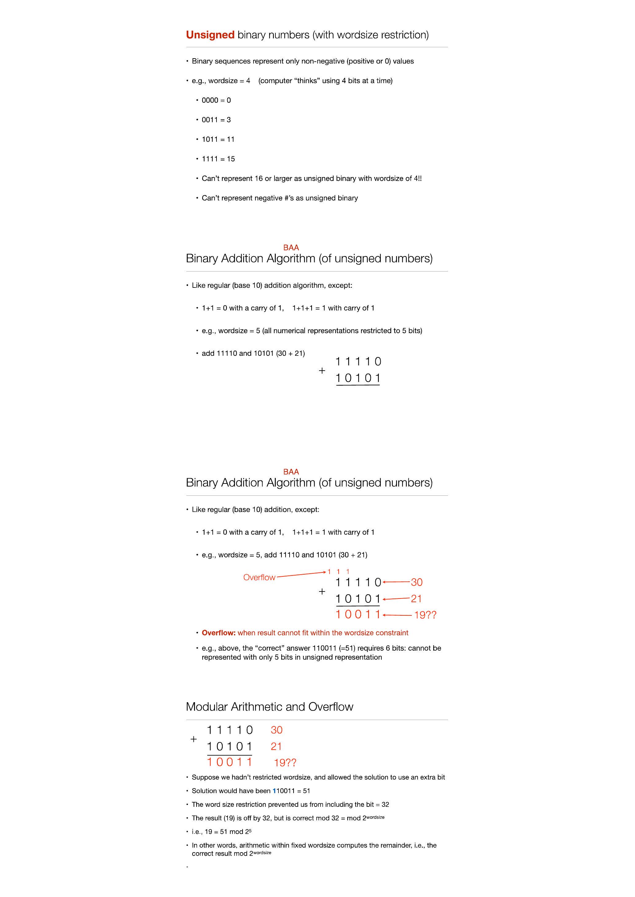 - 例如,上面,“正确”的答案 $110011(=51)$ 需要 6 位:不能仅用 5 位在无符号表示中表示