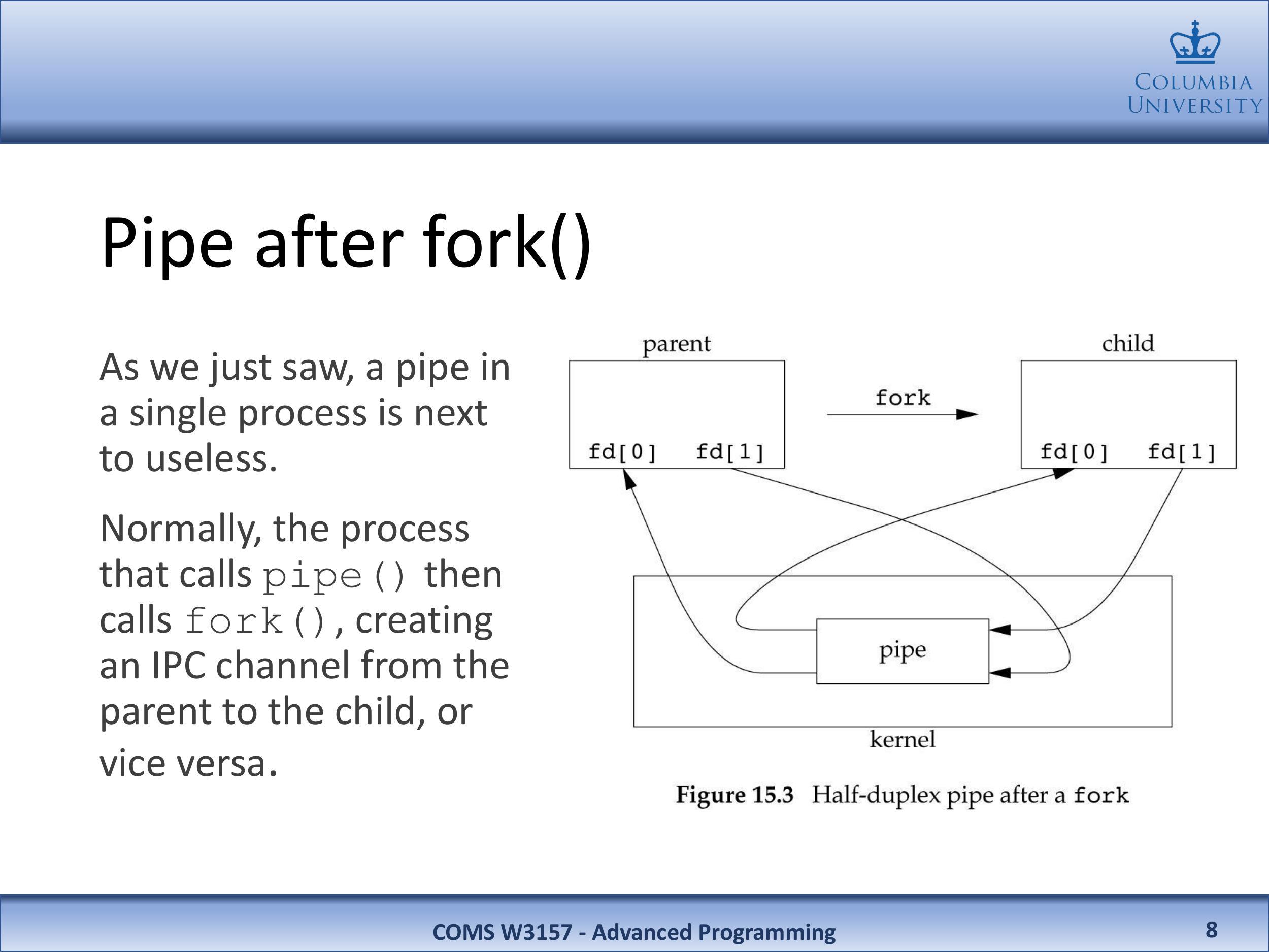 通常,调用 pipe() 的进程会接着调用 fork(),从而在父进程和子进程之间创建一个 IPC 通道,反之亦然。