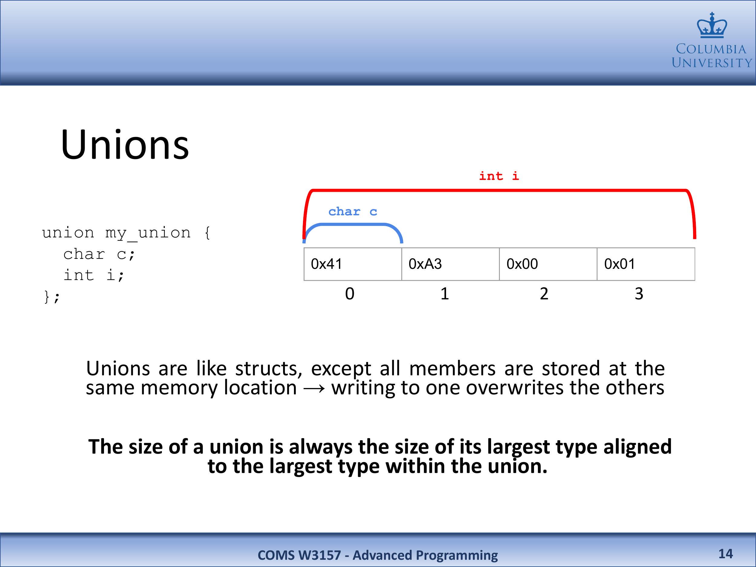 联合体类似于结构体,不同之处在于所有成员都存储在相同的内存位置 ⟶ 写入一个成员会覆盖其他成员。