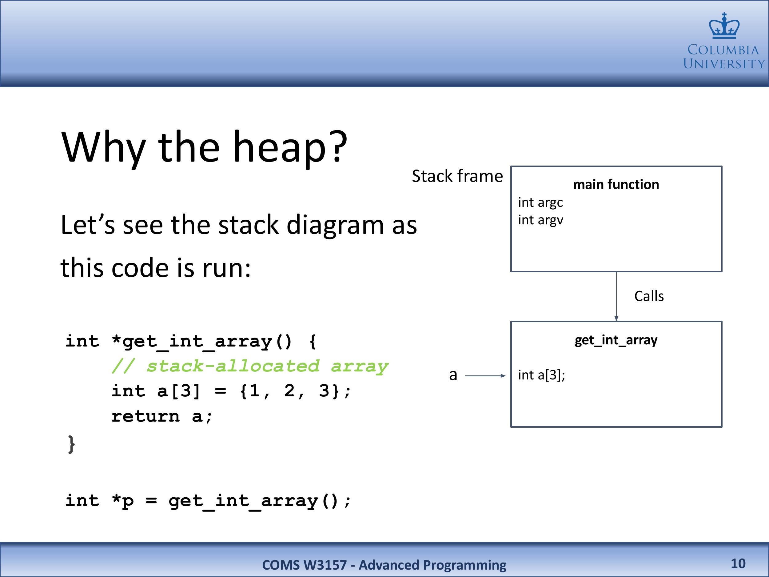假设你想编写一个函数来在栈上创建并返回一个整数数组。它可能看起来像这样:
