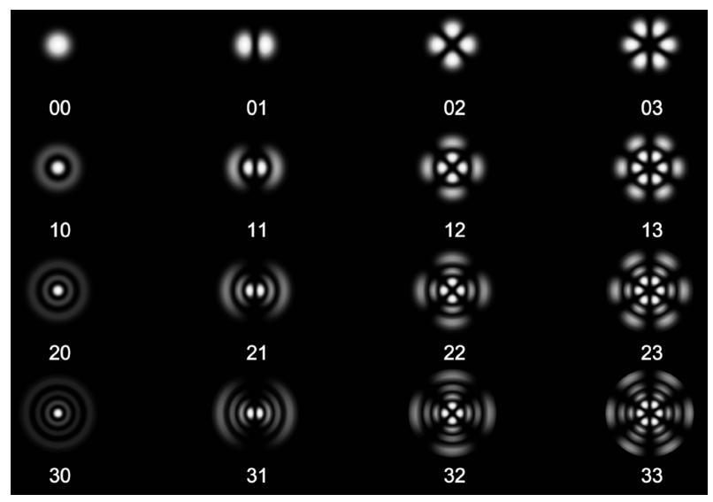 FIG. 10. Hermite-Gaussian nm modes. These are roughly rectangular arrays of 'rows' and 'columns'.