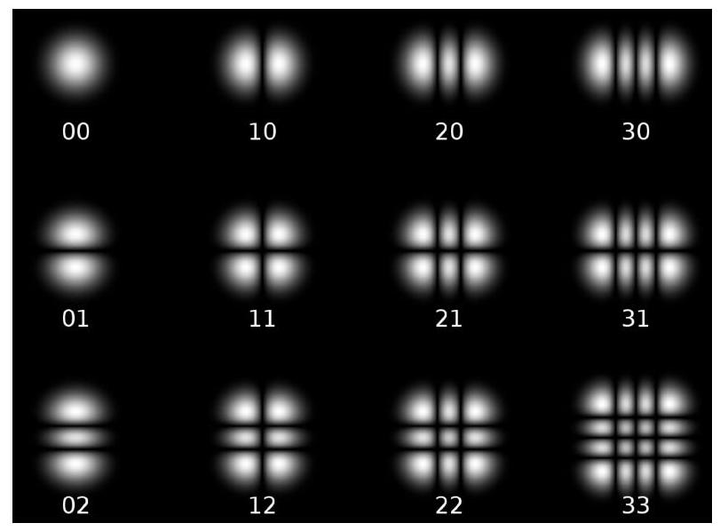 图10. 厄米特-高斯 nm 模式。这些大致呈现为具有个"行"和个"列"的矩形阵列。